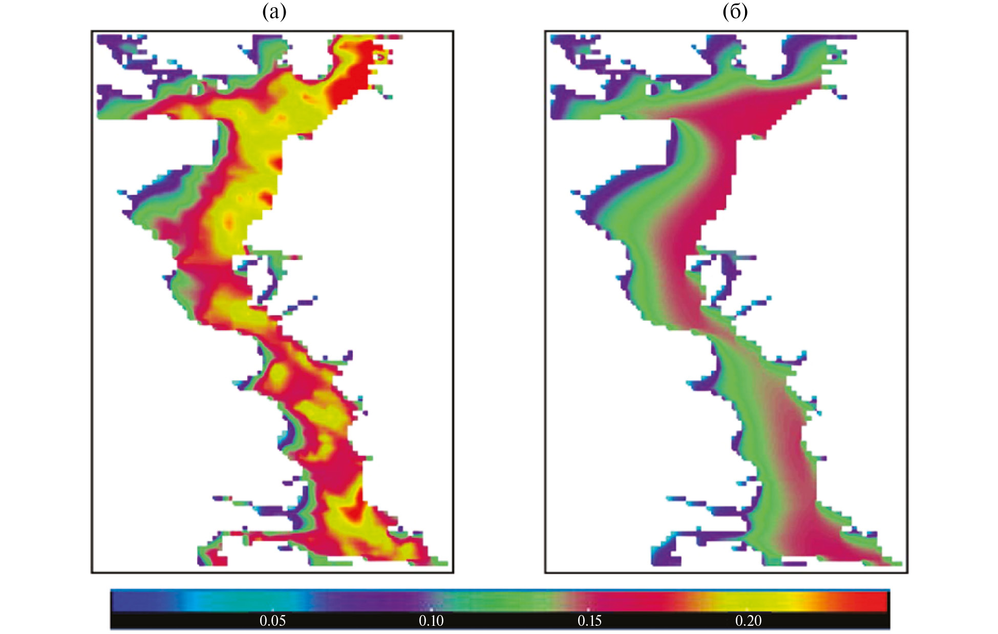 Рис. 9. Распределение значительной высоты волнения на Горьковском водохранилище для тестового дня 08.08.17 (a) накачка ветром при помощи WRF LES, (б) накачка ветром при помощи реанализа CFSv2