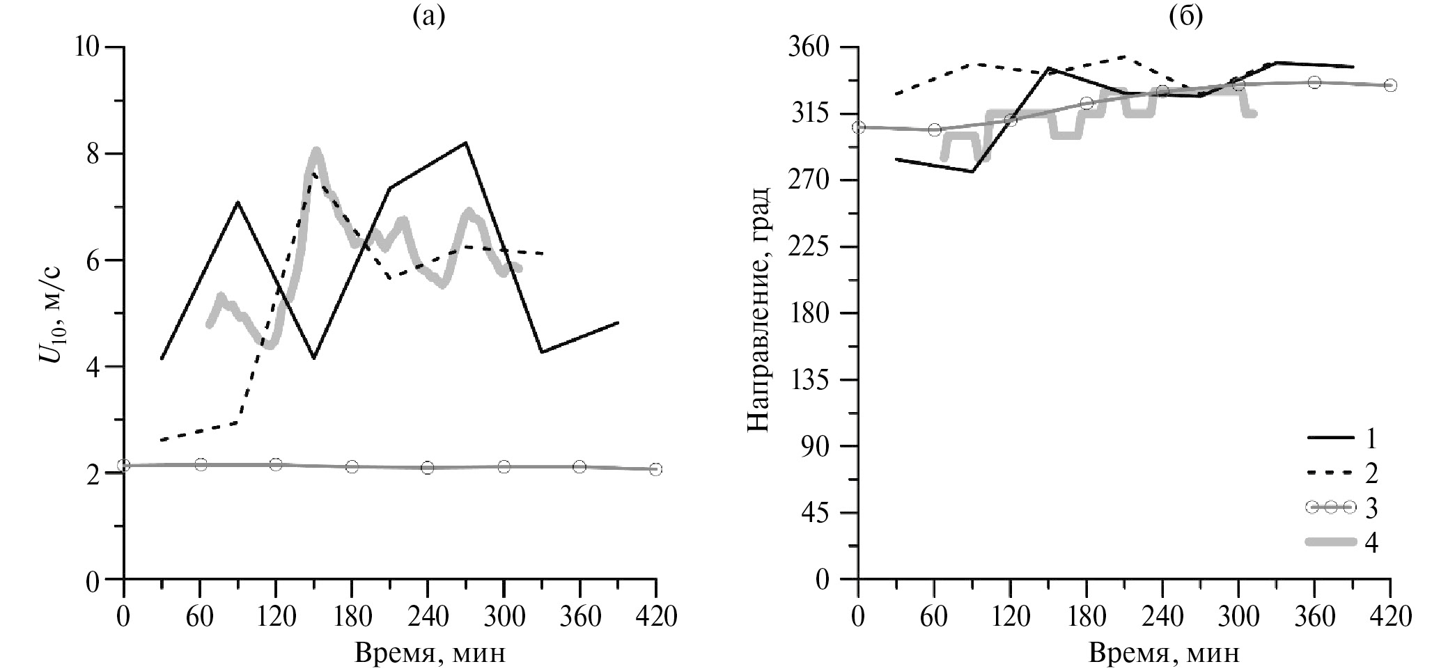 Рис. 10. Результаты расчета моделью WRF модуля скорости ветра (а) и направления ветра (б) с подключением разных параметризаций ППС и приповерхностного слоя атмосферы. 1 – WRF LES, 2 – WRF LES, объединенная с волновой моделью, 3 – данные реанализа, 4 – экспериментальные данные. Начало отсчета – 11:00 мск 08.08.2017