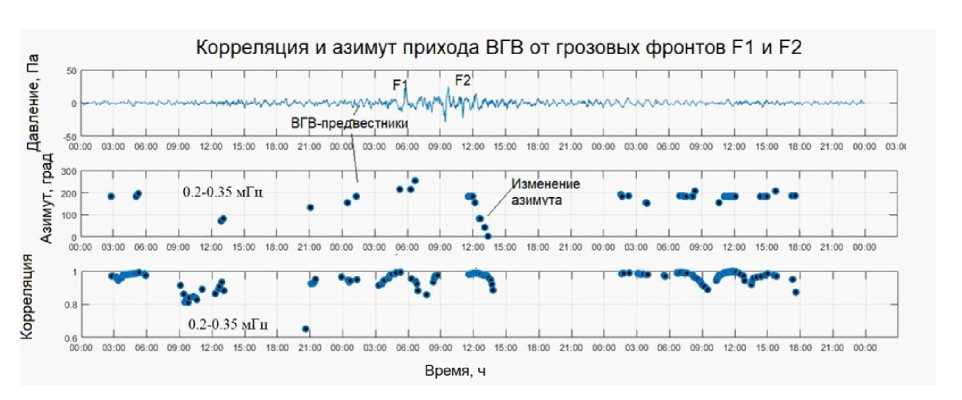 Изменение фазовой скорости волн с течением времени зависит от их частотного диапазона, что связано с дисперсией ВГВ. Для короткопериодных ВГВ-предвестников с периодами ~ 5.5 мин наблюдалась тенденция уменьшения горизонтальной фазовой скорости по мере приближения грозовой ячейки F1 примерно от 20 м/c до 5 м/c (рис. 3 в, нижняя панель). Однако, непосредственно перед ее приходом происходил резкий скачок горизонтальной фазовой скорости волны до 40–50 м/c с последующим резким спадом до 5 м/c, что можно объяснить прохождением грозовой ячейки F1 непосредственно над треугольной сетью микробарографов. Подобное поведение горизонтальной фазовой скорости волны наблюдалось также непосредственно перед прохождением грозовой ячейки F2. Однако, после ее прохождения над треугольной сетью и удаления от этой сети, начиная примерно с 12:00, происходило резкое изменение азимута прихода низкочастотных ВГВ почти на 180 град (указано на рис. 2, вторая панель сверху).