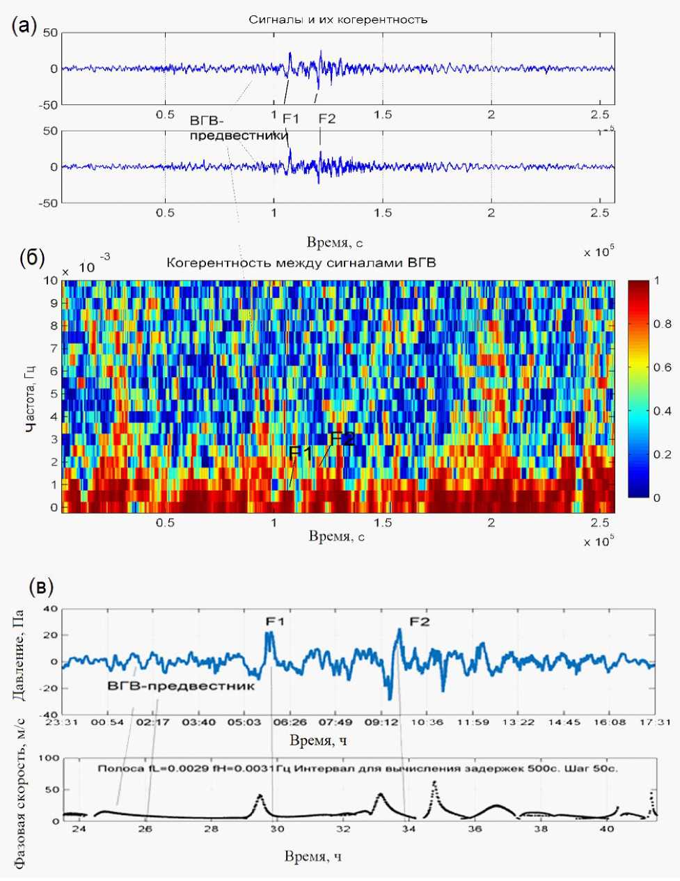 Когерентный анализ временных флуктуаций обнаружил максимумы на всех парных функциях когерентности на периодах 8–10 мин и 28–30 мин, типичных для ВГВ. По фазовым спектрам между временными флуктуациями , восстановленными вдоль трех направлений от источника к трем приемникам, удалось определить азимут прихода волнового пакета ВГВ относительно треугольной сети приемников и его горизонтальную фазовую скорость (5–6 м/c на периоде 28–30 мин).