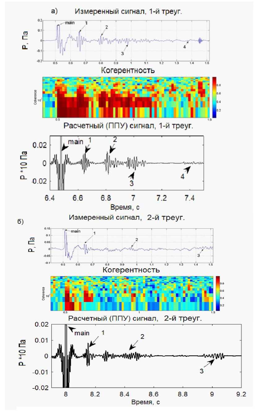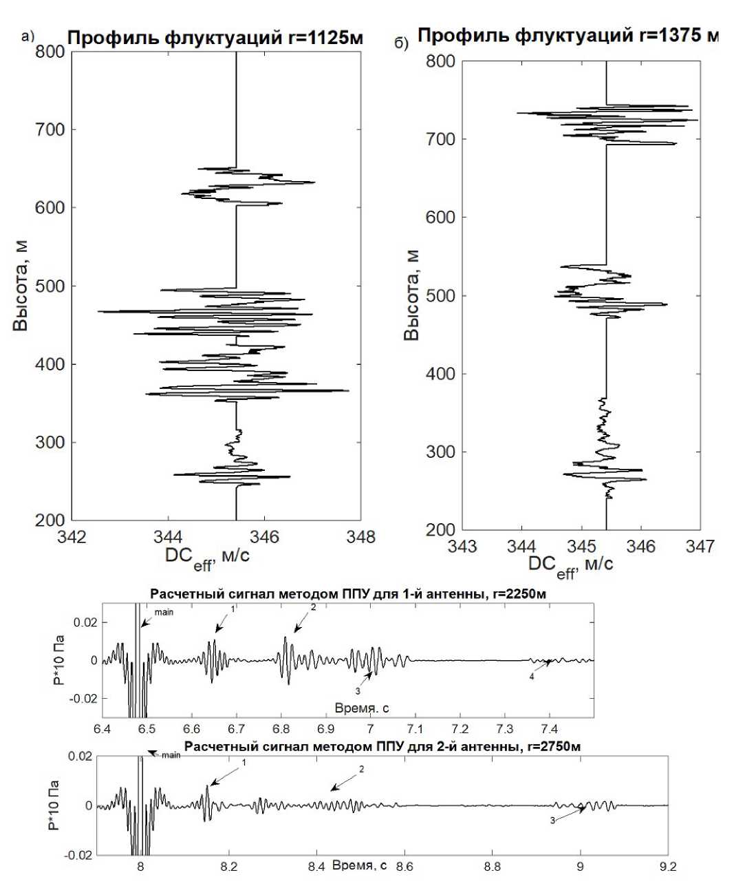 Один из сигналов, зарегистрированный 01.10.2018 в 19:36, с помощью двух треугольных антенн из акустических микрофонов Б&К на расстояниях = 2250 м и = 2750 м от противоградовой акустической пушки, и соответствующие этим антеннам средние (по трем парам треугольной антенны приемников) функции когерентности между сигналами показаны на рис. 6а и рис. 6б, соответственно. Сигнал был зарегистрирован в ночное время, когда сформировался приземный акустический волновод из-за наличия температурной инверсии и сдвига скорости ветра. Основной приход сигнала (“main”) вызван его волноводным распространением вдоль поверхности земли. Однако, на хвосте сигнала, следующего за его основным приходом, были обнаружены с помощью корреляционного анализа слабые по амплитуде приходы 1, 2 и 3. По формам и временам пробега этих приходов были восстановлены вертикальные профили флуктуаций на расстояниях 1125 м и 1375 м от источника (на рис. 7а, б). Эти приходы вызваны рассеянием сигнала на восстановленных флуктуациях , что хорошо подтверждается результатами расчета рассеянных приходов сигнала (на рис. 6 и рис. 7в) методом псевдо-дифференциального параболического уравнения (ППУ) [Avilov, 1995]. Расчетные приходы хорошо согласуются с зарегистрированными приходами сигнала по их формам, временам прихода и амплитудам (рис. 6а, б, верхняя и нижняя панели).