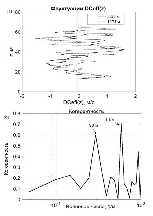 Рис. 8. Восстановленные вертикальные флуктуации в слое отражения сигнала 600–670 м на расстоянии 1125 м от источника, и в слое 700–770 м на расстоянии 1375 м от источника (а) и когерентность между вертикальными флуктуациями , восстановленными на расстояниях 1125 и 1375 м от источника (б).