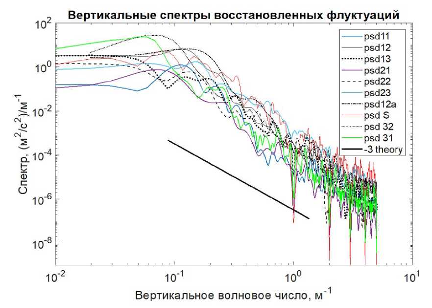 Вертикальный спектр предсказывается также его теоретической моделью формирования [Chunchuzov, 2018]. Эта модель учитывает существенное влияние на формирование спектра нелинейного процесса адвекции внутренних волн и горизонтальных вихревых движений ветром, вызванным суммарным полем всех внутренних волн и вихрей. При больших вертикальных волновых числах , где – характерное вертикальное волновое число, N — частота Брента–Вяйсяля в слое, — среднеквадратичное значение вертикальных флуктуаций скорости ветра в слое, теоретический спектр флуктуаций горизонтальной скорости ветра приобретает универсальную форму где численный коэффициент . Например, для флуктуаций в слое 600–670 м (рис. 8 а) значение , следовательно, при типичном среднем значении частоты рад/c в устойчивом АПС, вертикальный масштаб м.