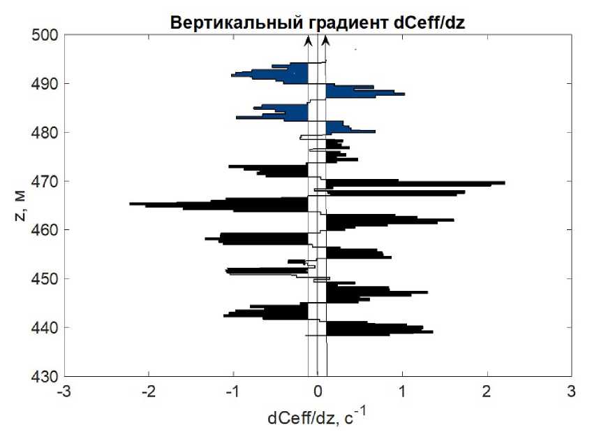 Рис. 10. Вертикальные осцилляции градиента в слое 430–500 м.