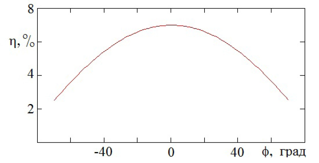 тогда величина η — относительное отличие максимумов модулей потоков при учете fc и при неучете fc. На рис. 6 представлен график зависимости η от широты в горизонтально-неоднородном случае. Величина η достигает максимума в окрестности экватора и монотонно спадает к полюсам, хотя сами потоки стремятся к нулю при приближении к экватору.