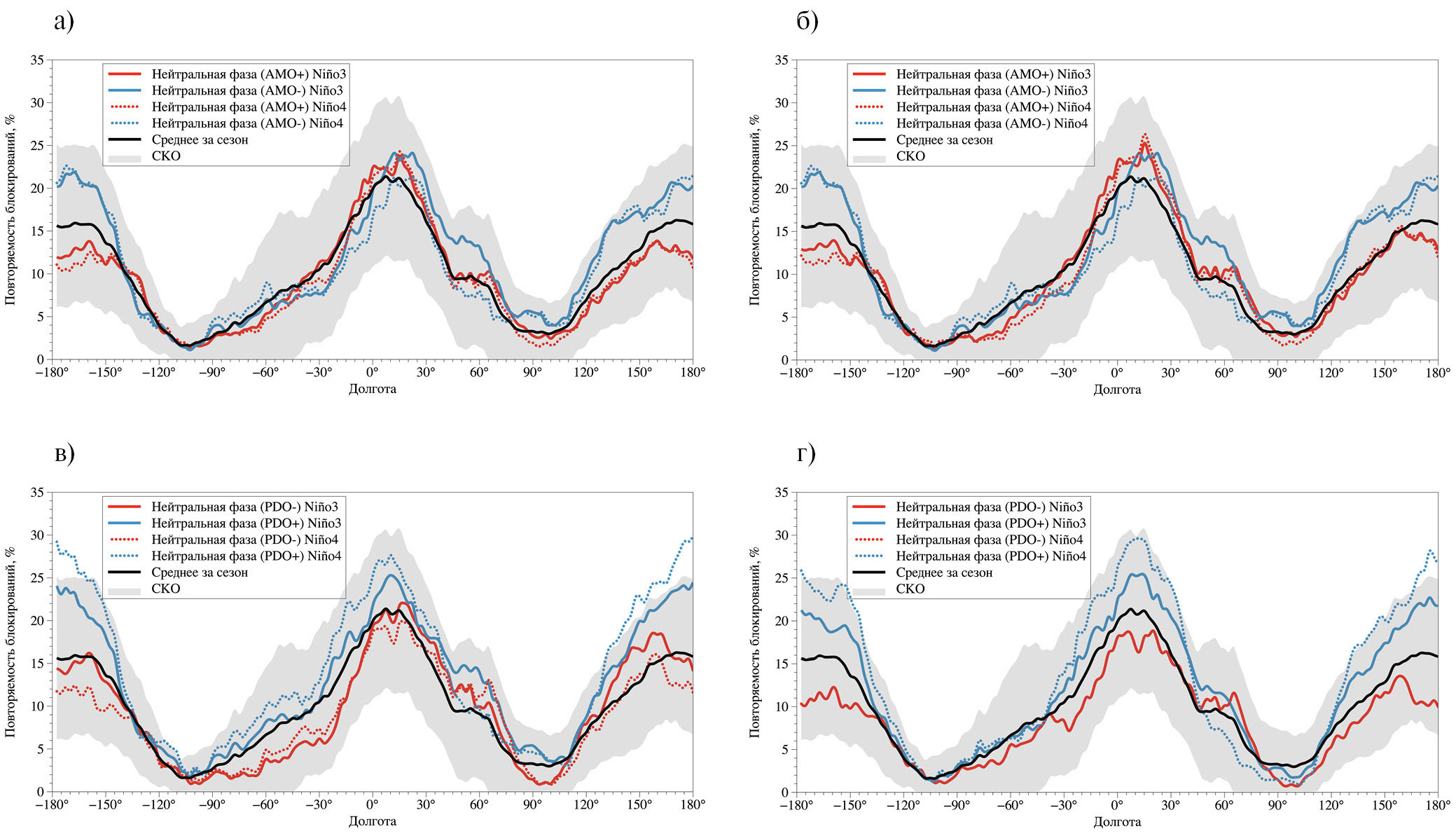 На рис. 1–4 представлены оценки повторяемости p зимних атмосферных блокирований (доли дней с блокированием) в средних широтах Северного полушария в зависимости от долготы — средние значения (черная кривая) и диапазон межгодовой изменчивости, характеризуемый СКО, по данным для периода 1979–2018 гг. Диапазон СКО приводится для оценки статистической значимости различий между разными фазами. Наибольшие значения средней повторяемости и межгодовой изменчивости зимних атмосферных блокирований отмечаются над европейскими регионами, а также над среднеширотными акваториями Тихого океана. Проявляется также увеличение повторяемости зимних блокирований над Уральскими горами. Пониженные значения p отмечаются для внутриконтинентальных регионов.
