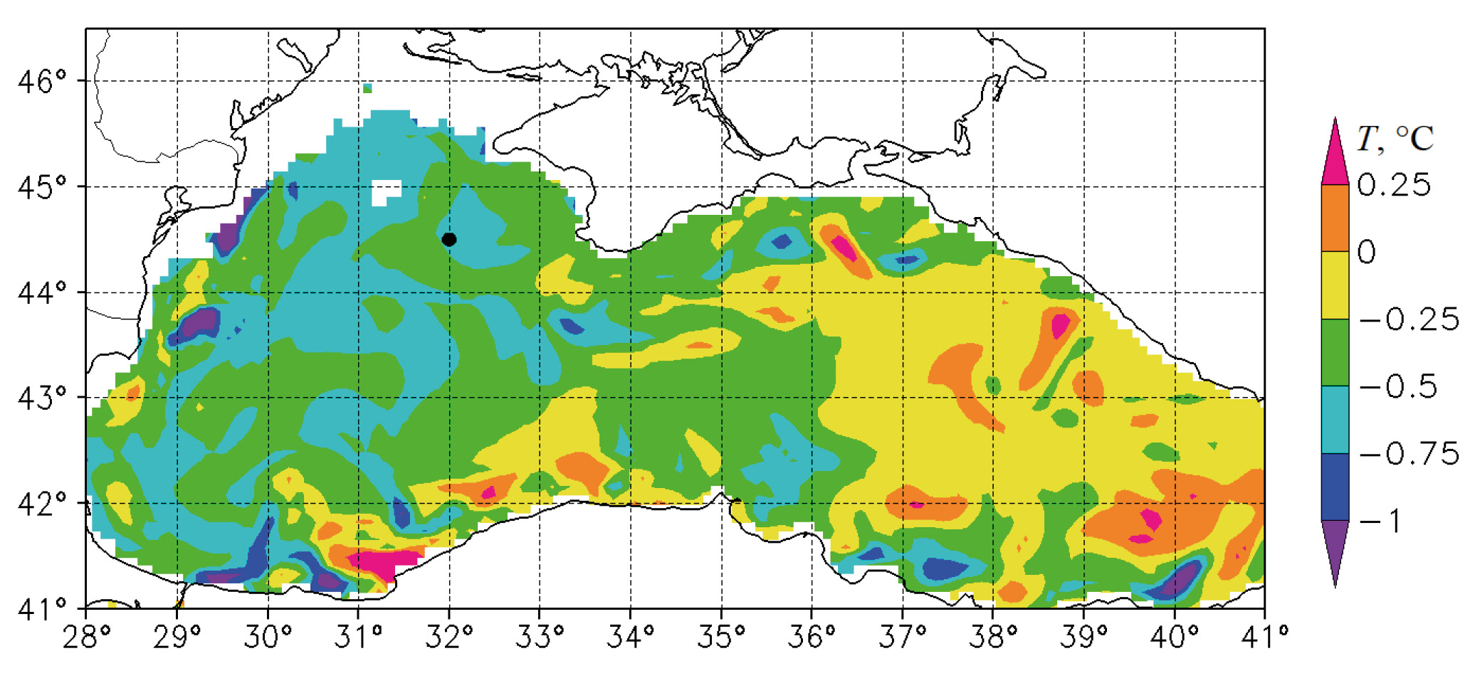 Наиболее предсказуемой реакцией моря на ВХВ является понижение температуры в верхнем слое моря. Изменения температуры на поверхности за время одного из таких эпизодов ВХВ 23–25 января 2010 г. по данным реанализа составили –1.5…–1 °C. Даже на глубине 30 м (см. рис. 1) видно понижение на величину до ~ –0.75…–0.25 °C в большей части Черного моря, особенно в его западной половине, где развивался особенно сильный ветер. На бо́льших глубинах 50–60 м понижение температуры проявляется в виде отдельных локальных мезомасштабных неоднородностей.