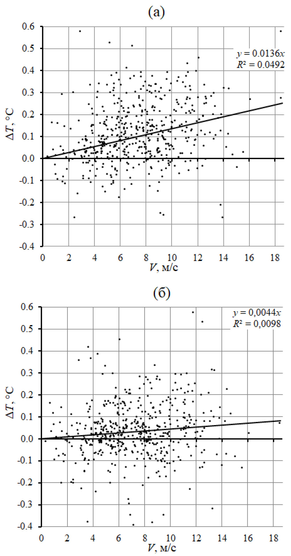 Оценка средней величины понижения температуры в течение двух суток охлаждения при скорости ветра 10 м/c составляет на глубинах до 50 м 0.2–0.6 °C. Не приводя иллюстраций, отметим характерную особенность изменения температуры по глубине: во всем слое от поверхности до глубины 30–40 м величина понижения температуры ∆T была почти постоянной и составляла около 0.2 °C, и лишь на глубинах бо́льших ~40 м cтала быстро уменьшаться. Реакция температуры воды на ВХВ прослеживается вплоть до глубин 70–80 м, хотя сами численные оценки здесь становятся на уровне 0.05 статистически незначимыми.