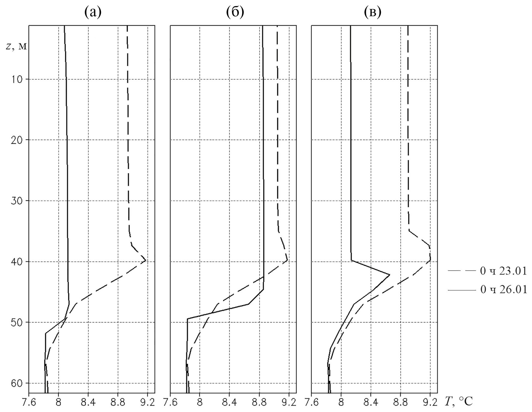 Рис. 5. Изменение вертикальных профилей температуры (°С) за время холодного вторжения 23–25 января 2010 г. в точке (32° в.д; 44.5° с.ш.) для а) основного расчета, б) эксперимента 1, в) эксперимента 2.