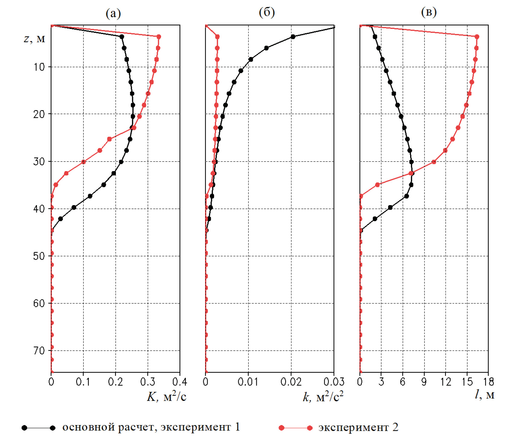 Как видно из рис. 7б, распределение ТКЭ с глубиной качественно одинаково во всех расчетах — наибольшие значения ТКЭ находятся вблизи поверхности моря. В эксперименте 2 ТКЭ в целом на два порядка меньше. Из рис. 7в видно, что большие значения коэффициента K в эксперименте 2 (см. рис. 7а) вызваны большими значениями l. Увеличение масштаба турбулентности не только скомпенсировало уменьшение ТКЭ, но и привело к росту K на рис. 6в.