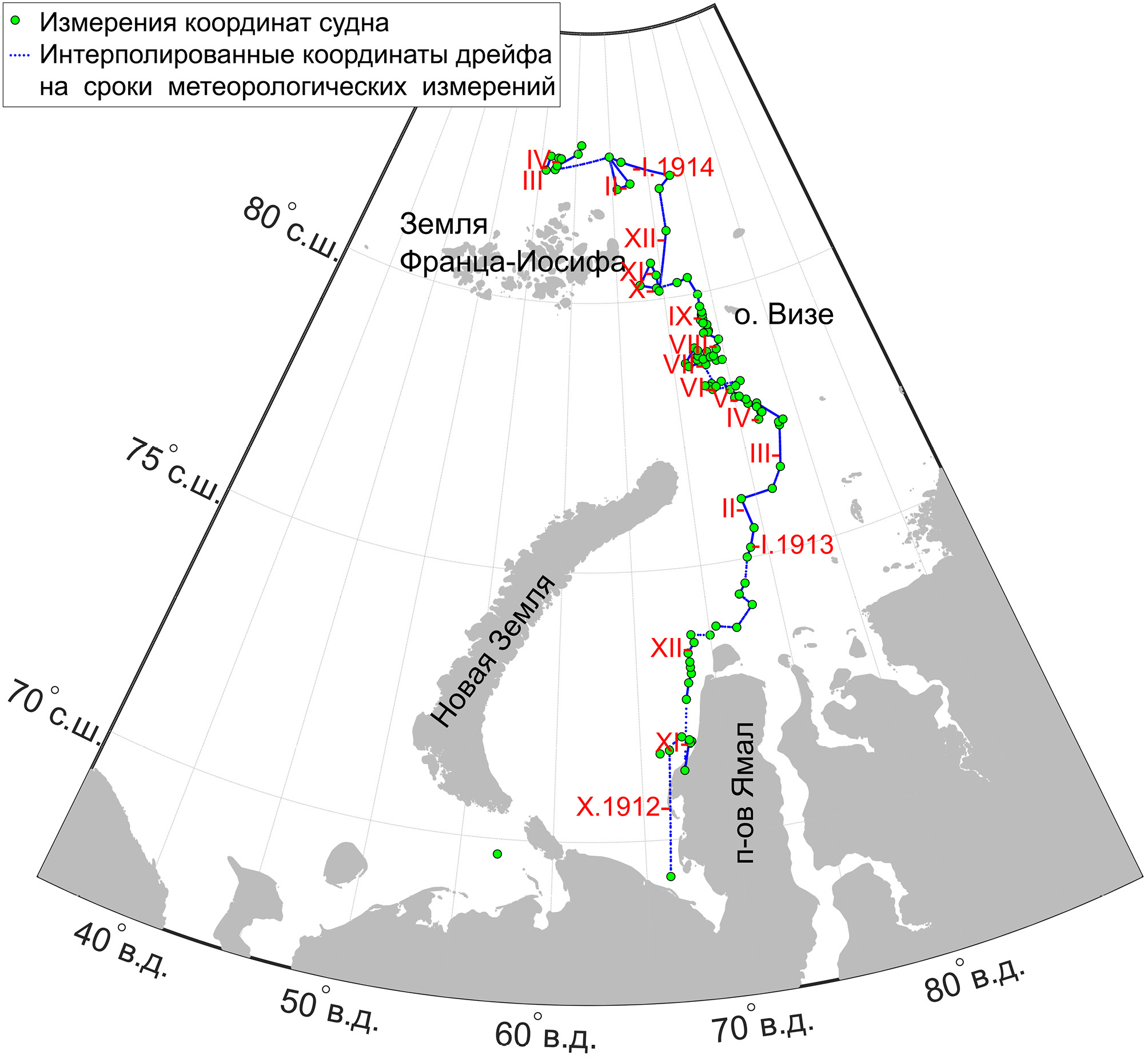 Рис. 1. Карта дрейфа шхуны «Св. Анна» в 1912–1914 гг.