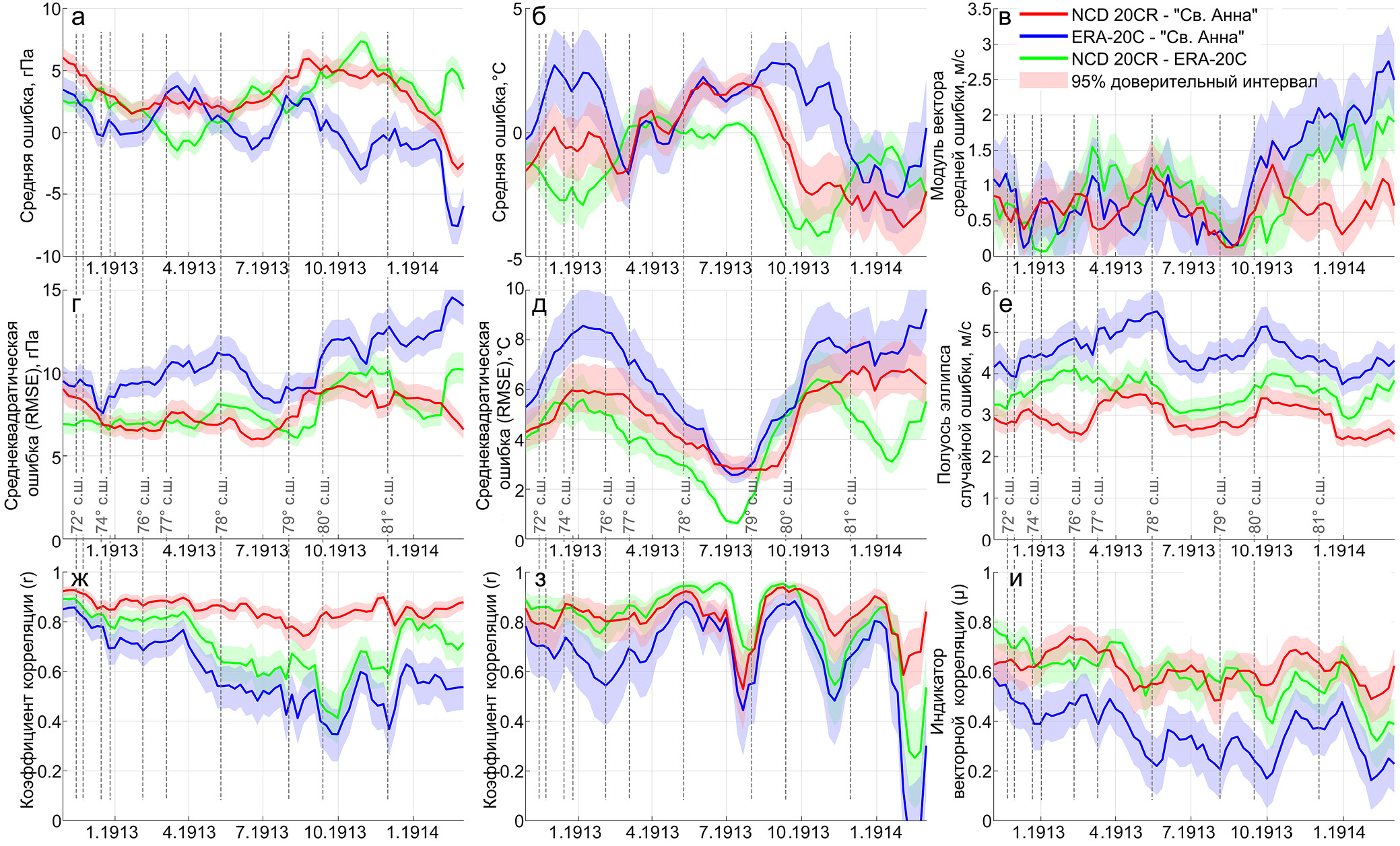 Рис. 3 в основном подтверждает оценки, представленные в табл. 1–3 для отдельных сезонов: для всех метеорологических параметров коэффициент корреляции максимален между измерениями и данными реанализа NCD 20CR, среднеквадратическая ошибка минимальна также у реанализа NCD 20CR, средняя ошибка рядов атмосферного давления минимальна у реанализа ERA-20C. Средняя ошибка температуры воздуха реанализа NCD 20CR меньше средней ошибки реанализа ERA-20C на отрезке дрейфа судна до широты 76° с.ш., затем до широты 81° с.ш. оба реанализа показывают сопоставимые значения средней ошибки, севернее 81° с.ш. абсолютное значение систематической ошибки реанализа ERA-20C несколько меньше. Южнее 80° с.ш. значения модуля вектора средней ошибки у обоих реанализов примерно одинаковы, севернее этой широты средняя ошибка ветра реанализа ERA-20C существенно увеличивается. Коэффициент корреляции между рядами измеренной температуры воздуха и данных обоих реанализов уменьшается в июле 1913 г., в летний временной отрезок отмечается уменьшение значения среднеквадратической ошибки (рис. 3).