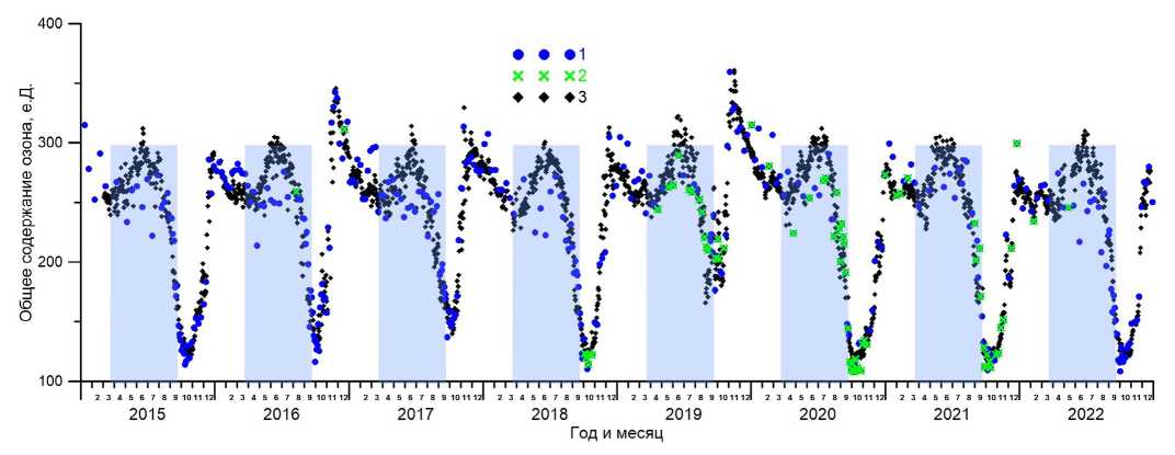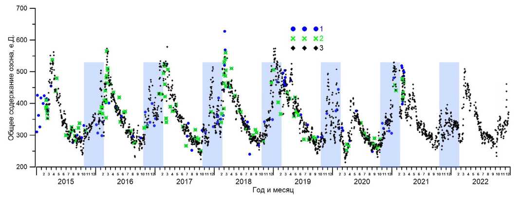 Рис. 2. ОСО по данным озонозондирования станции Eureka (80°с.ш.) и среднесуточные ОСО ИКФС-2 в круге радиусом 70 км. Цветом выделены периоды полярной ночи. 1-все озонозонды, 2 – озонозонды, достигшие уровня 10 гПа, 3 – ИКФС-2, среднесуточное в круге радиусом 70 км.