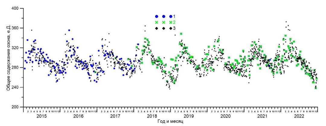 Данные озонометрической сети представлены единичными измерениями приборами Добсона и Брюера. Спектрометр Добсона был разработан в 1924 году британским физиком и метеорологом Гордоном Добсоном. Спектрофотометр Добсона может использоваться для измерения как ОСО, так и профилей озона в атмосфере. Спектрометр сравнивает интенсивность солнечного излучения на двух различных длин волн, 305 и 325 нм, (в полосе поглощения озона и вне ее) и определяет их отношение, на основе которого вычисляется ОСО. Инструменты регулярно взаимно калибруются, что обеспечивает согласованность получаемых данных [Андреев и др., 2023]. Спектрофотометр Брюера компании Kipp&Zonеn, основанный на сходных физических принципах, является в настоящее время единственным эталонным автоматизированным прибором, рекомендованным Всемирной метеорологической организацией (ВМО) для измерения общего содержания озона. Мы используем только измерения по прямому солнечному излучению, поскольку они являются наиболее точными. Согласно [Kerr, 2002], точность таких единичных измерений составляет 1–2%.
