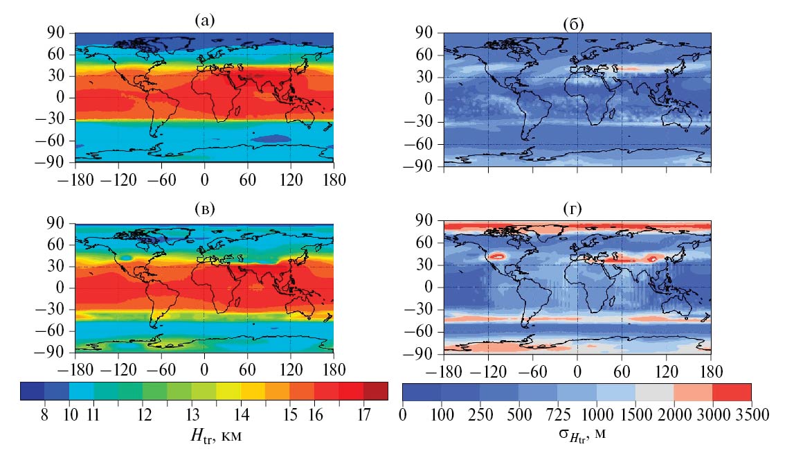 На рис. 2–4 представлены полученные оценки среднегодовых и сезонных значений высоты тропопаузы с соответствующими межгодовыми СКО по данным ERA5 и NCEP/DOE II для 1980–2023 гг. Межгодовое СКО высоты тропопаузы не превышает нескольких сот метров в большинстве регионов и во все сезоны (рис. 2–4). При этом для таких регионов значения σHtr по данным NCEP/DOE II получены большими, чем по данным ERA5. Это можно по крайней мере частично связать с более грубым вертикальным разрешением первого массива данных по сравнению со вторым. В пространственном распределении СКО выделяются максимумы в субтропиках (особенно для холодного полушария) и в высоких широтах Северного и Южного полушарий. Значения σHtr при этом могут превышать 3 км. Субтропические максимумы СКО более выражены в зимнем полушарии по сравнению с летним, (в переходные сезоны указанные максимумы сравнимы для Северного и Южного полушарий; не показано) и в целом согласуются по данным двух использовавшихся реанализов. Пространственный максимум σHtr над Северным Ледовитым океаном проявляется только летом и только по данным ERA5. Полученные результаты согласуются с [Wilcox et al., 2012a].
