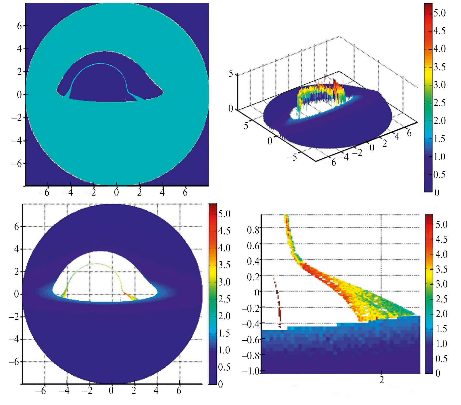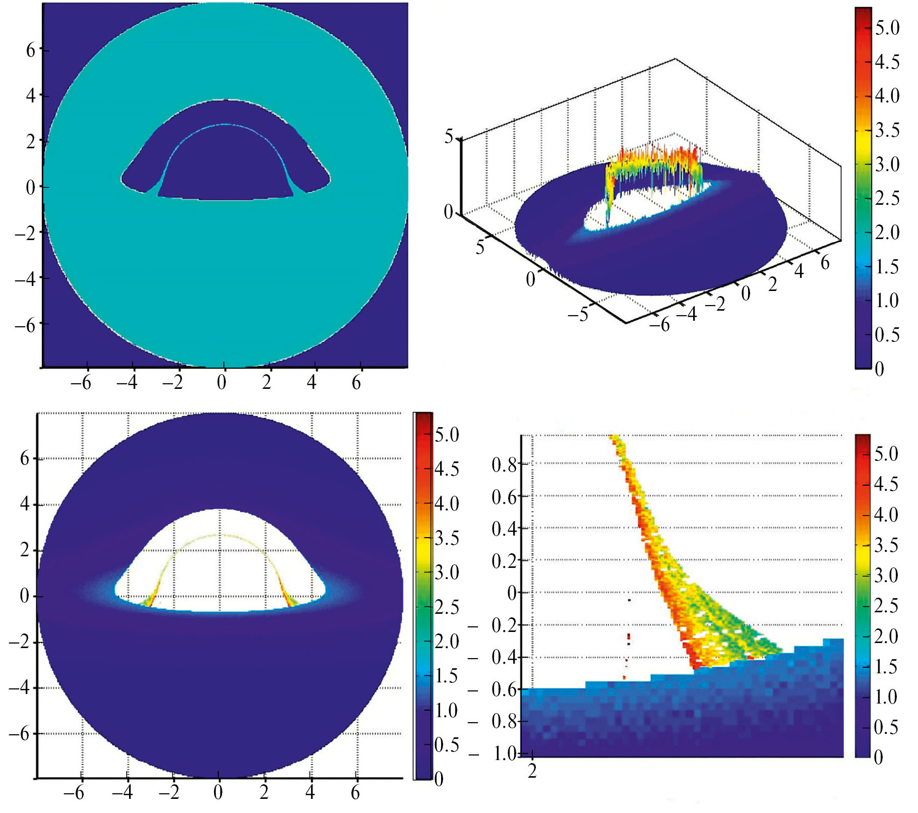 Для того чтобы сделать изображение тени ЧД более приближенным к реальной картине, было учтено, что каждый пиксель изображения содержит разное количество фотонов. Левая нижняя панель рис. 2–5 отображает относительную интенсивность излучения. Видно, что для гало она медленно спадает по мере увеличения радиуса, что соответствует падению температуры для релятивистского диска. Правая верхняя панель позволяет проиллюстрировать различие интенсивностей фотонного кольца и гало, видно, что их отношение составляет примерно три порядка. Нижняя правая панель позволяет рассмотреть фотонное кольцо более подробно и увидеть, что его внешний (более близкий к гало край) имеет гораздо большую интенсивность, чем внутренний.