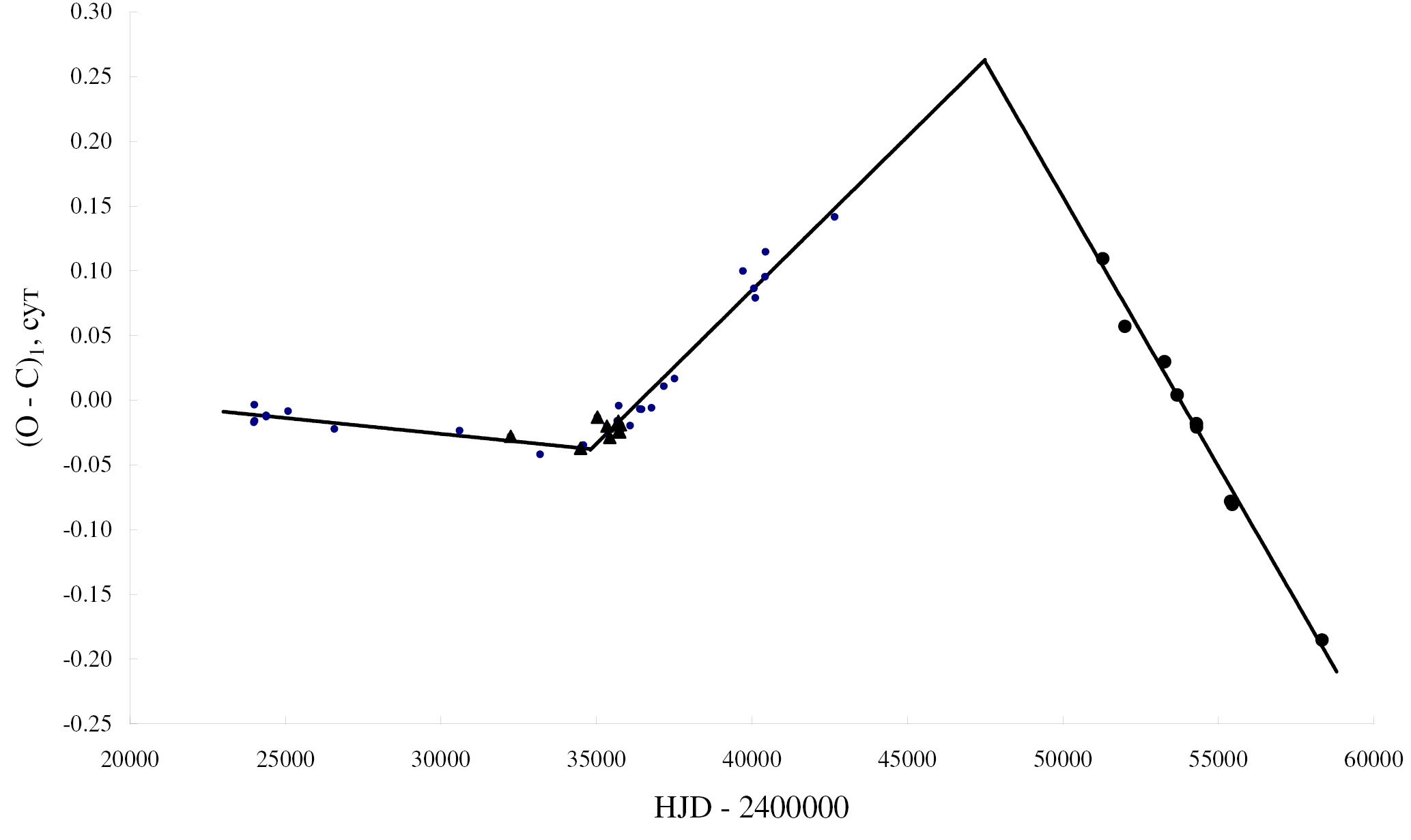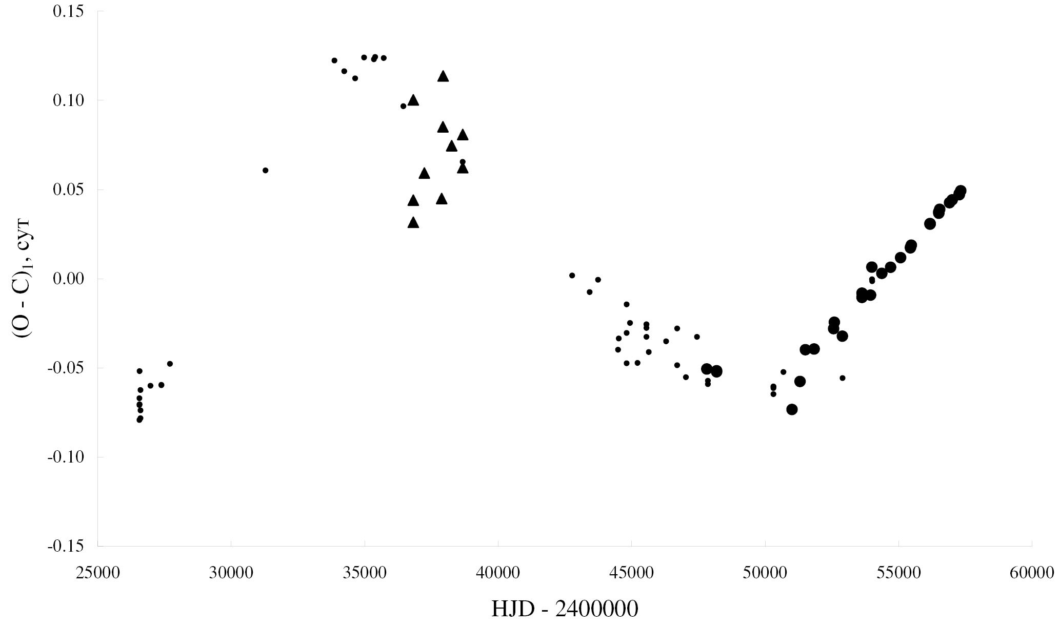где T — эпоха наблюдения. На этом рисунке фотографические точки представлены в виде треугольников, визуальные наблюдения — маленькими точками, фотоэлектрические и из ПЗС-наблюдений — большими точками. Через эти точки можно провести три прямые. Таким образом, имеется три промежутка времени, в течение которых период остается неизменным: