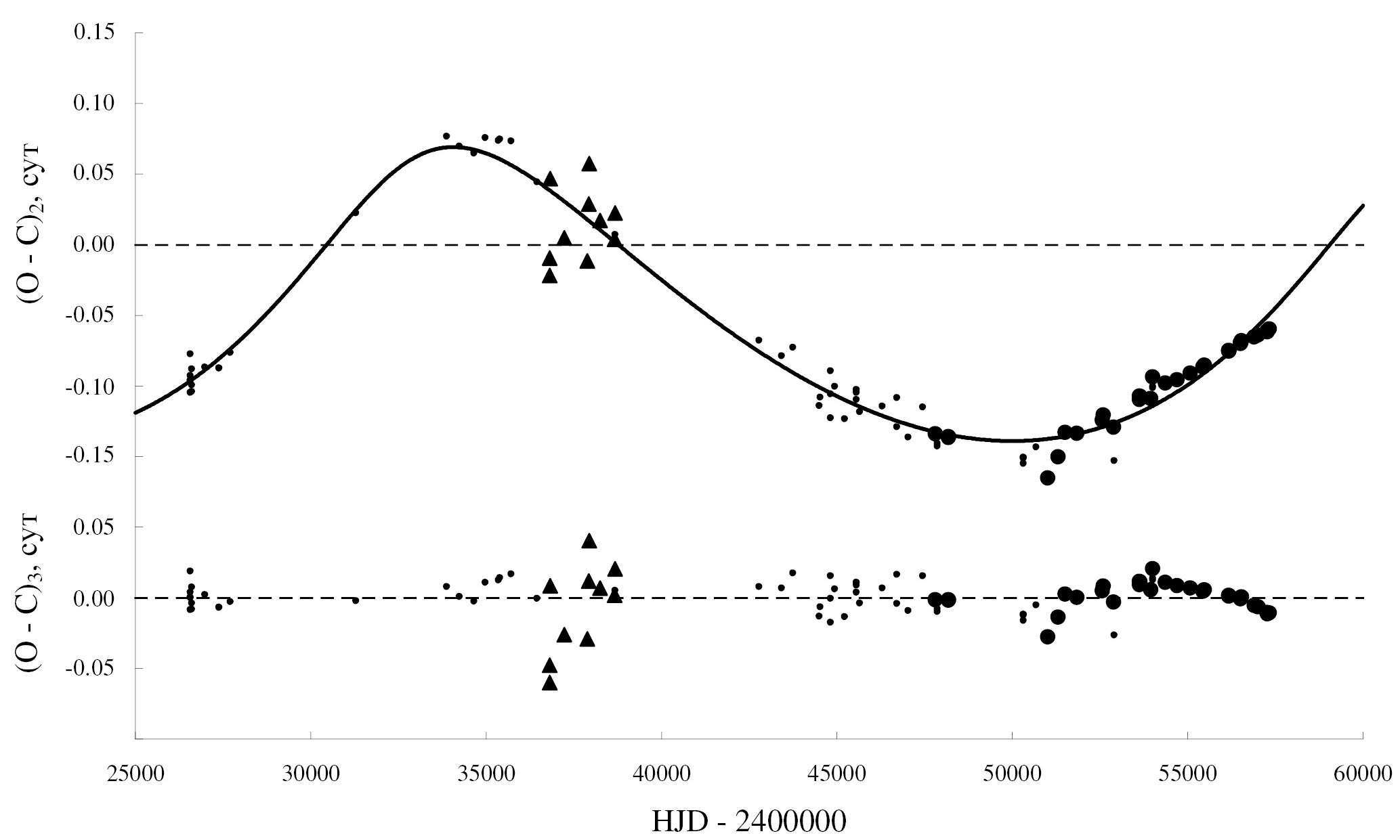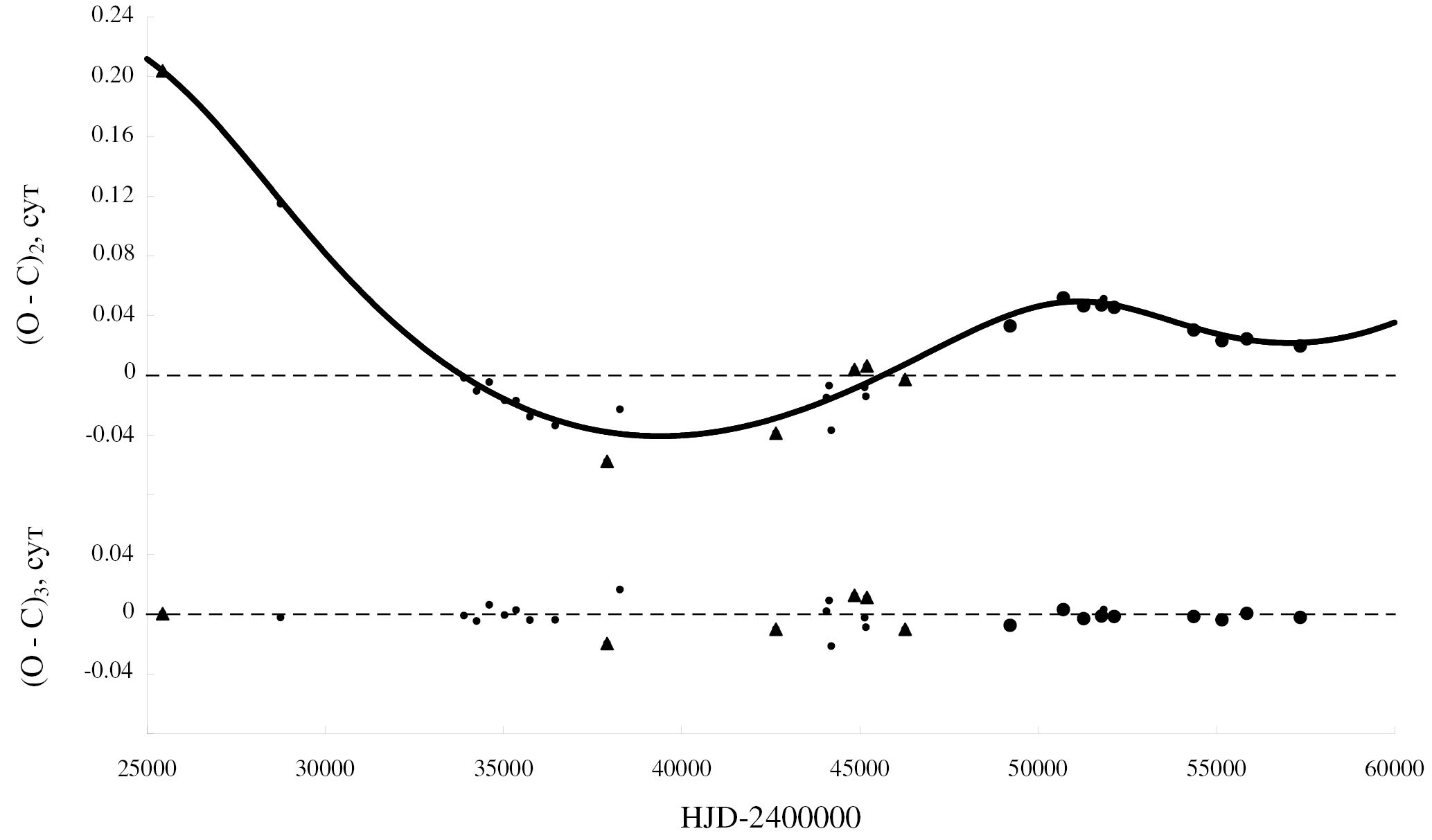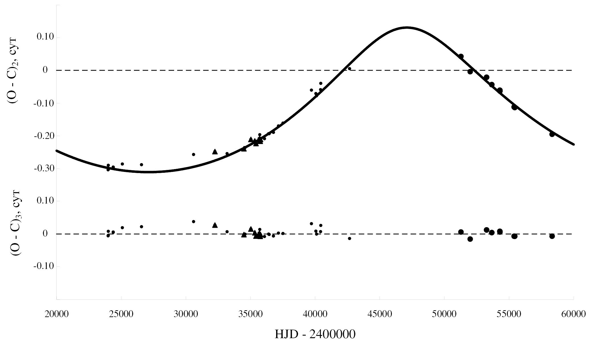 Параметры светового уравнения были определены тем же способом, что и в предыдущем разделе. Эти параметры приведены в первом столбце табл. 3. В таблице использованы те же обозначения, что в табл. 1. На рис. 4 приведены отклонения (O – C)₂ наблюдаемых (О) моментов минимумов BG Peg от вычисленных (C) с линейными элементами из представления (5). Сплошная линия на этом рисунке — теоретическая кривая для светового уравнения с параметрами из табл. 3. На этом рисунке видно, что кривая для светового уравнения неплохо описывает наблюдения. Однако отметим, что полученные параметры светового уравнения следует считать предварительными, для их уточнения нужны новые высокоточные наблюдения. Остатки после вычитания из наблюдаемых моментов минимумов теоретических, вычисленных по формуле (5), приведены в нижней части рис. 4.