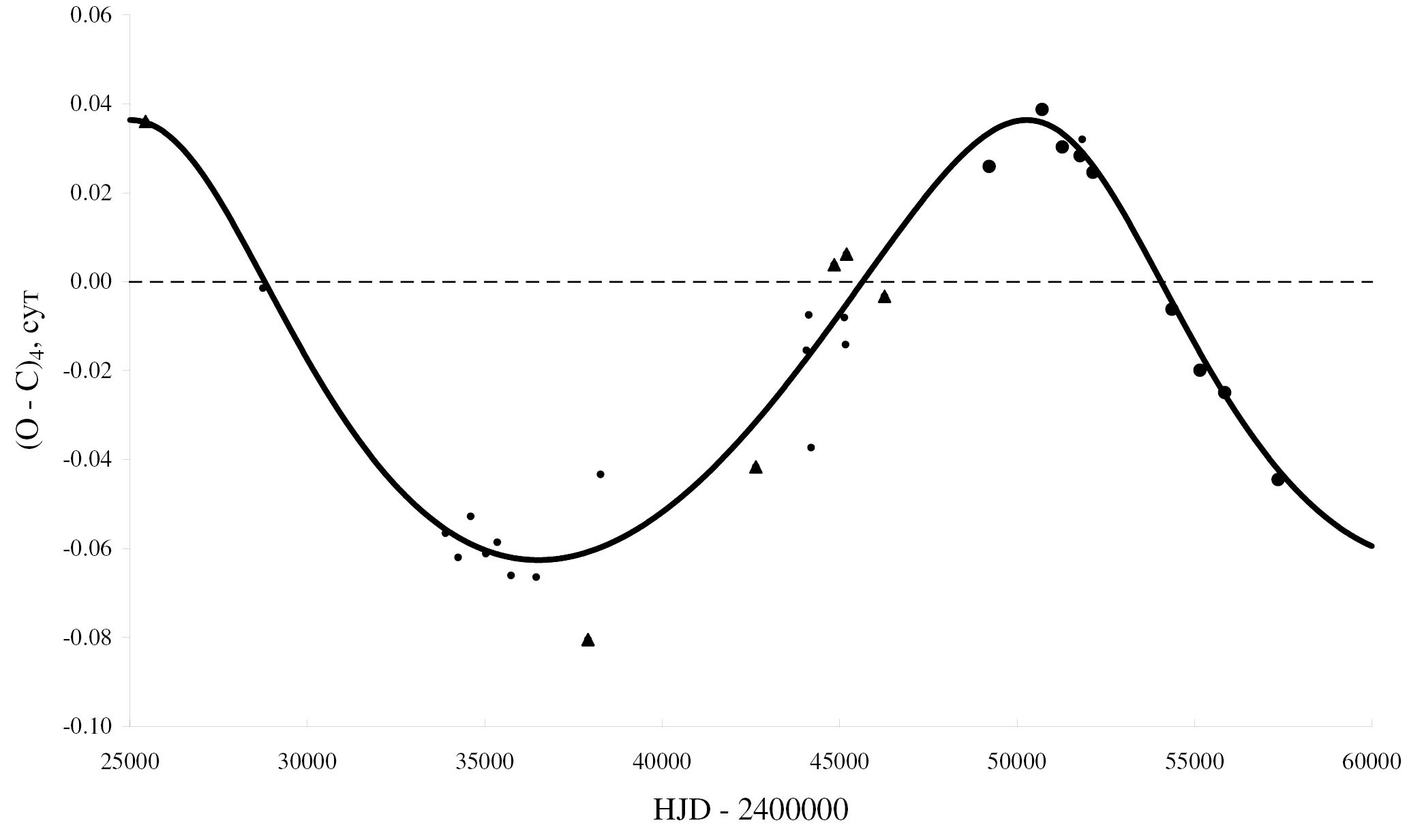 где T — эпоха наблюдения. Обозначения такие же, как на рис. 1. Из рисунка видно, что кроме вековых изменений периода, рассмотренных в работах [29] и [30], в системе наблюдаются циклические колебания периода, которые проявили себя благодаря самым последним наблюдениям моментов минимумов. В дальнейшем анализе мы не использовали сильно отклоняющуюся точку JD = 2452908.679, а остальные моменты минимумов были представлены квадратичной зависимостью, параметры которой были определены также методом наименьших квадратов:
