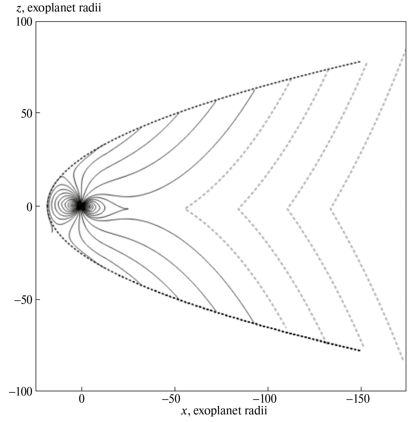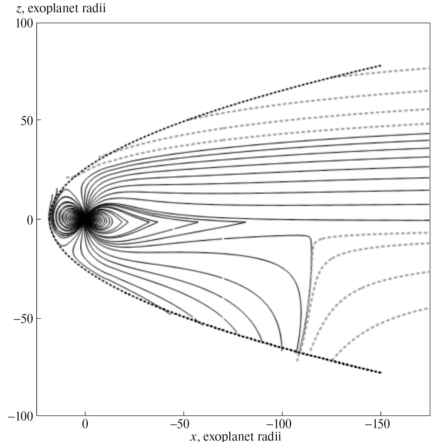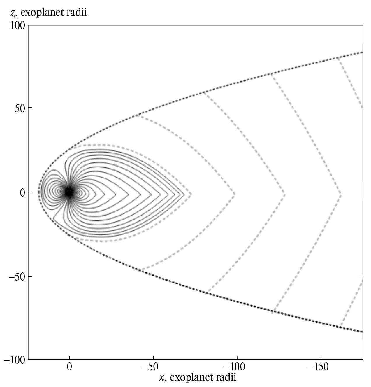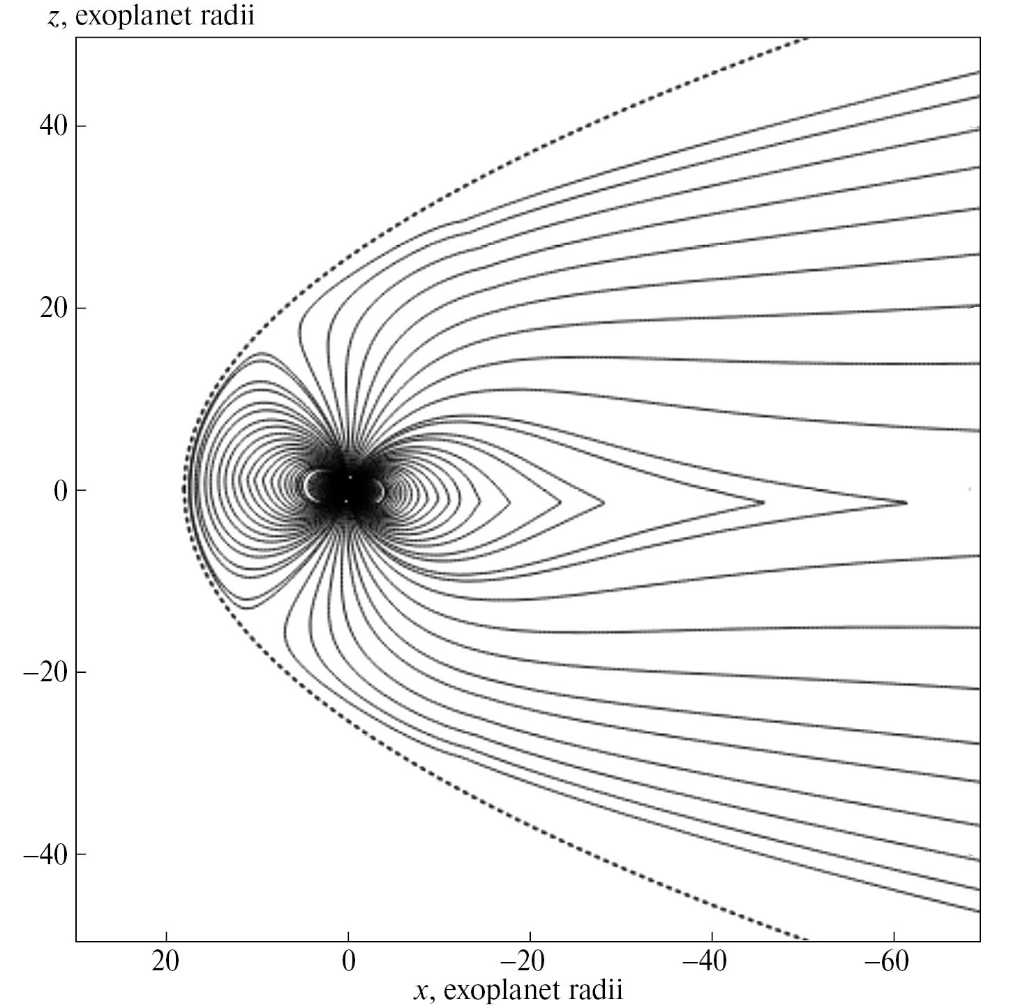 Рис. 1. Магнитосфера экзопланеты HAT-P-11b для равного нулю ММП в сечении полдень-полночь. Параметры модели приведены в тексте статьи, магнитный момент экзопланеты направлен на север. Сплошными линиями показаны магнитные силовые линии; пунктирной — магнитопауза. Кружком обозначена экзопланета. X и Z координаты отложены по горизонтальной и вертикальной осям.