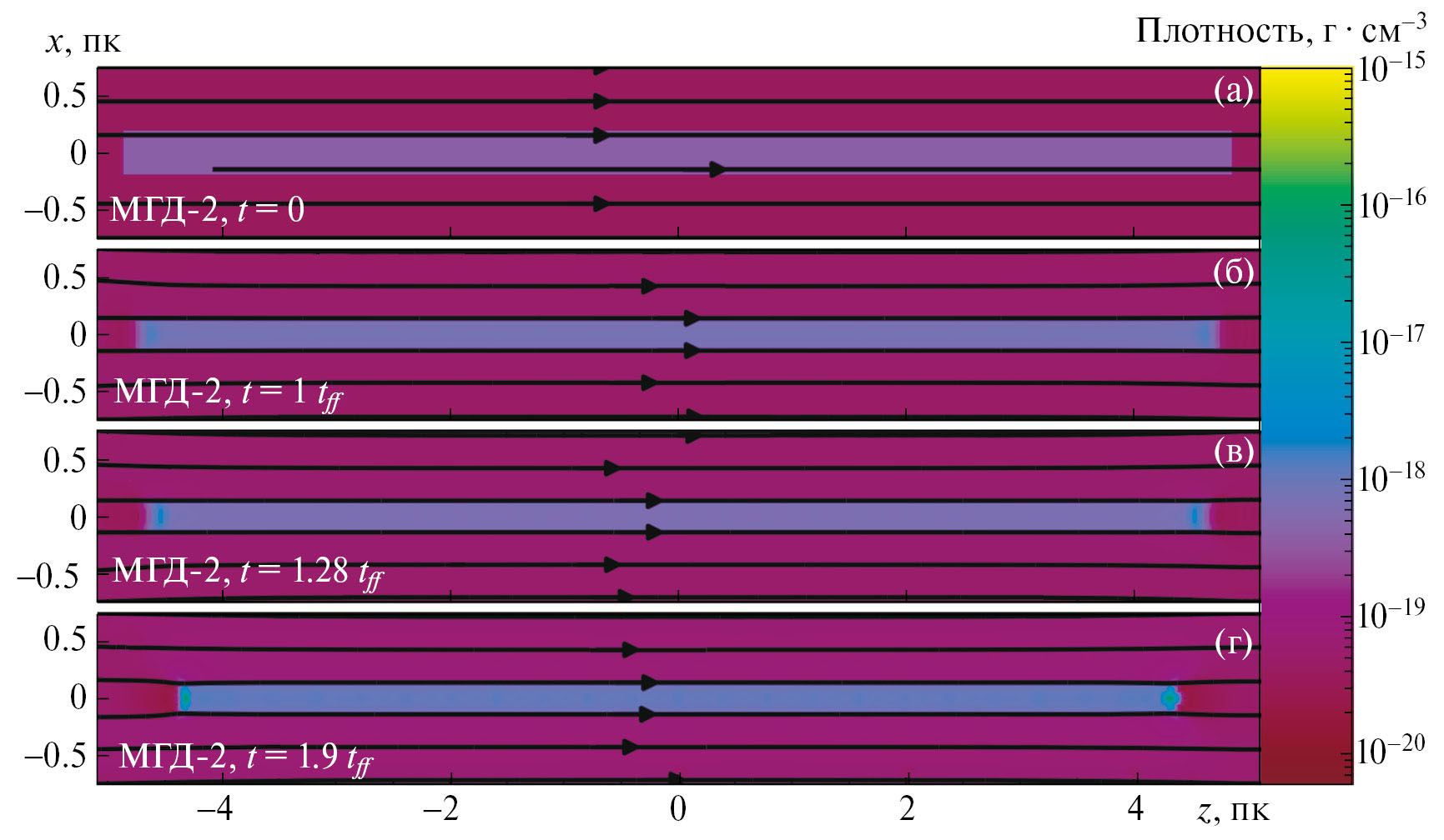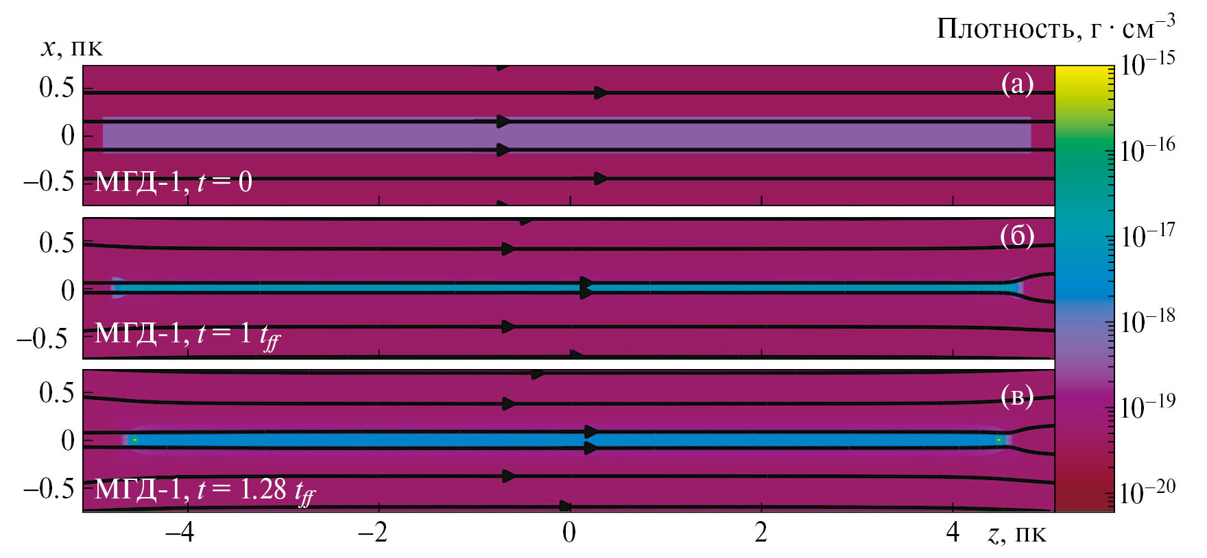 На рис. 3 приведены срезы плотностей в плоскости x – ɀ для расчета МГД-2 в моменты времени t = 0.1tff , 1.28tff , 1.9tff . В расчете МГД-2 картина коллапса качественно похожа на результаты для варианта МГД-1. Волокно сжимается до радиуса r ≈ 0.3 пк и концентрации n ≈ 2×10⁵ см⁻³к моменту времени 1tff , после чего сжатие останавливается и начинаются осцилляции волокна вдоль радиуса. Плотность образующихся на торцах волокна ядер к моменту времени 1.9tff составляет n ≈ 2×10⁷ см⁻³.