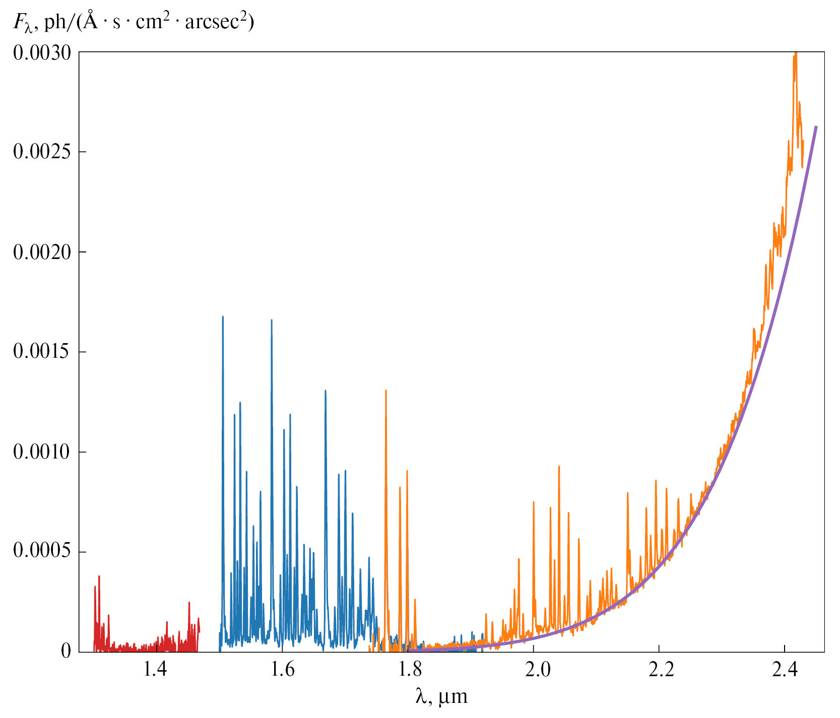 На рис. 1 представлен спектр ночного неба, зарегистрированный 21.09.2023 камерой ASTRONIRCAM в спектральном режиме работы [10] с экспозицией 600 с в каждом канале. В спектре хорошо заметны эмиссионные линии, принадлежащие молекулам OH–, и резкий рост интенсивности излучения на длинах волн >2 мкм. Последний вызван, в основном, тепловым излучением элементов телескопа, попадающих в поле зрения камеры. Видно, что вклад инструментального фона заметен только в полосе K, в полосах Y, J, H его вклад пренебрежимо мал.