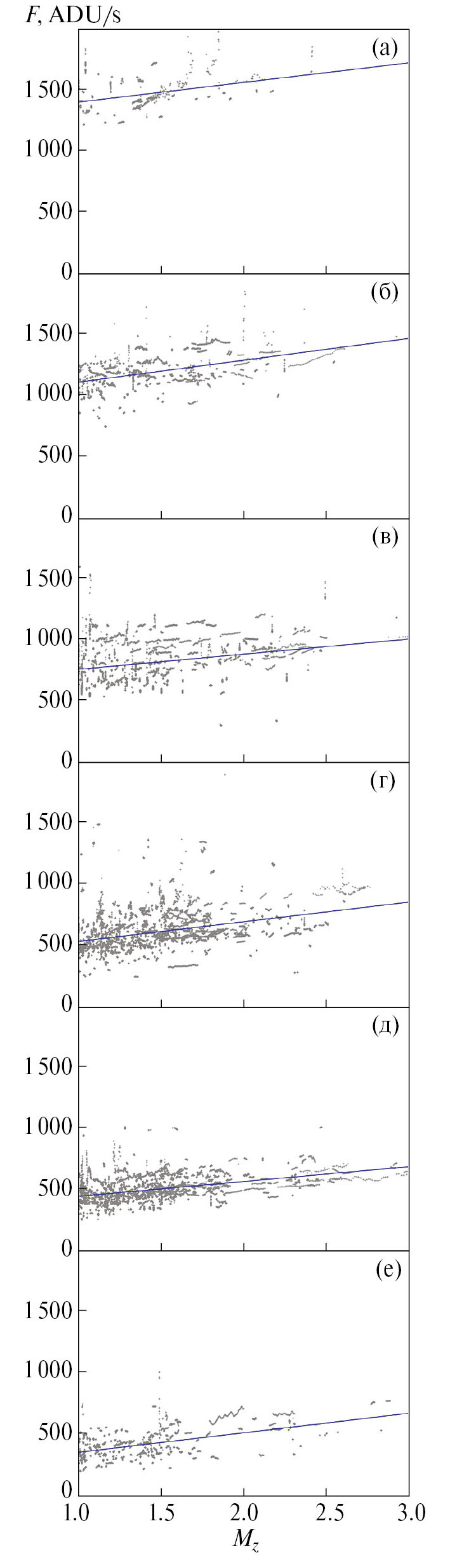 Рис. 2. Зависимость наблюдаемого потока от фона в полосе K от воздушной массы Mɀ для разной температуры трубы телескопа: 15–20°C (a), 10–15 °C (б), 5–10°C (в), 0–5°C (г), от -5°C до 0°C (д), от –10°C до –5°C (е). Серыми точками показаны отдельные измерения, синие линии — аппроксимации данных прямыми.