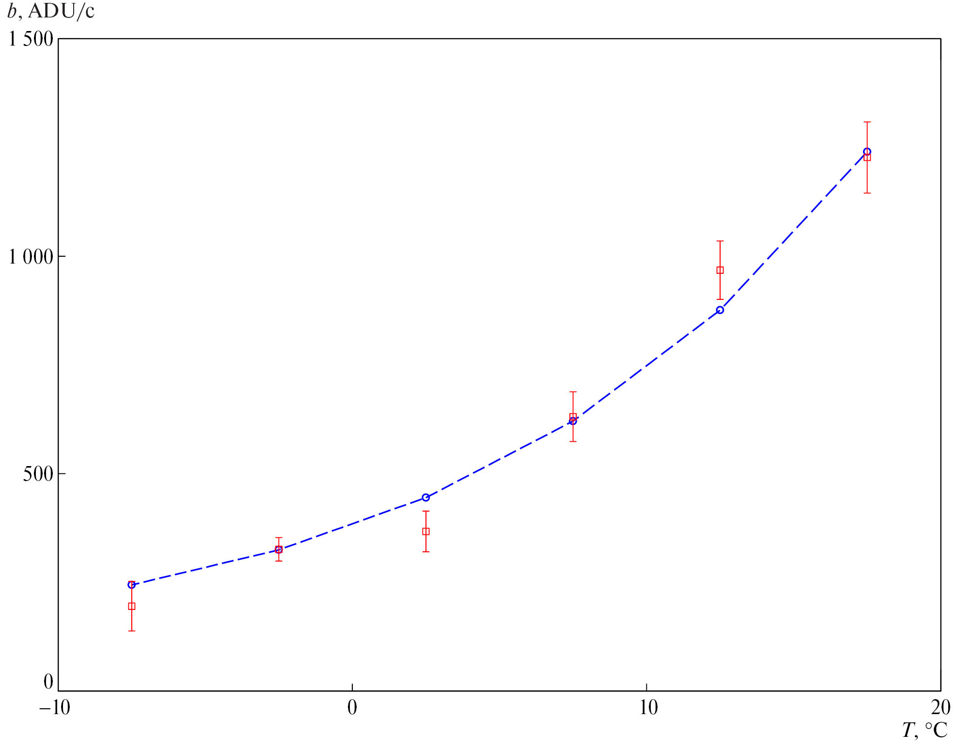 Видно, что вычисленные точки хорошо описывают наблюдаемую зависимость b(T ). Это позволяет выделить среднее значение постоянного вклада заатмосферного фона C ≈ 100 ADU/с и оценить величину e, имеющую при фиксации расстояния до АЧТ размерность площади. Для характерного расстояния 5 м e ≈ 750 см².