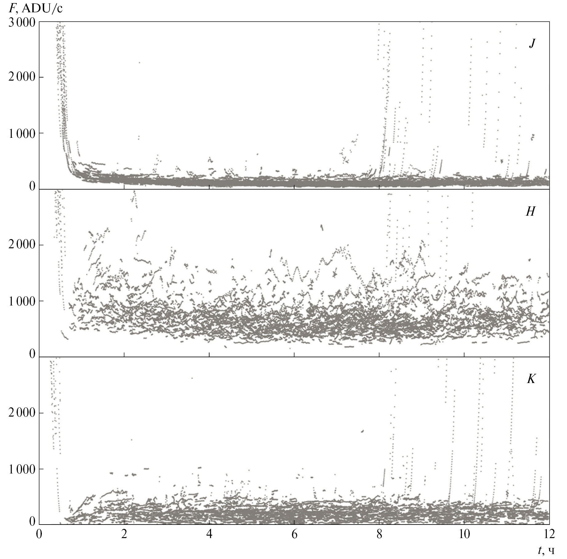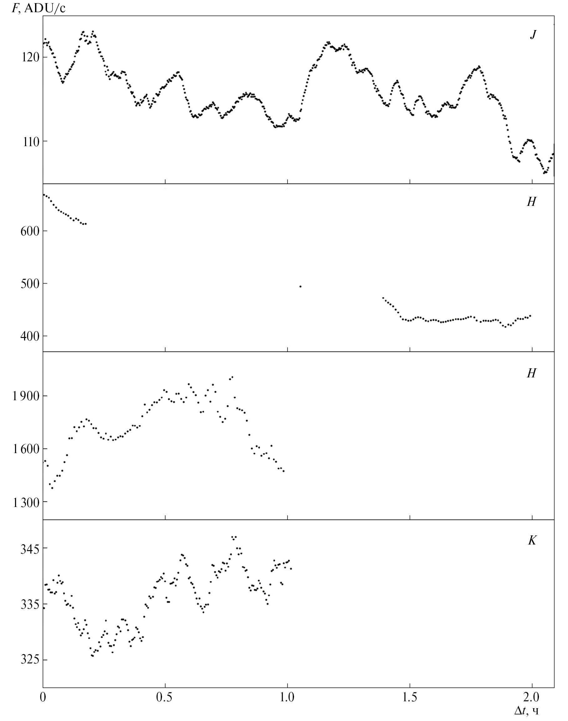 На рис. 10 показаны характерные примеры кривых изменения яркости в полосах J, H, K. Для полосы H приведен пример с сильной переменностью фона (изменение на 50% за 30 минут) и малой переменностью на коротком масштабе времени (~10% за 30 минут). Однако видно, что на большем временном отрезке изменение фона может быть гораздо сильнее (до тех же 50% за 2 часа). Колебания уровня фона в полосах J и K могут иметь амплитуду до ~10%. Большую часть времени фон демонстрирует в 2–3 меньшую переменность, чем указано выше. Сравнение полученных величин с данными других обсерваторий (см., напр., [13, 11] и ссылки там) говорит о похожем характере переменности яркости фона в них.