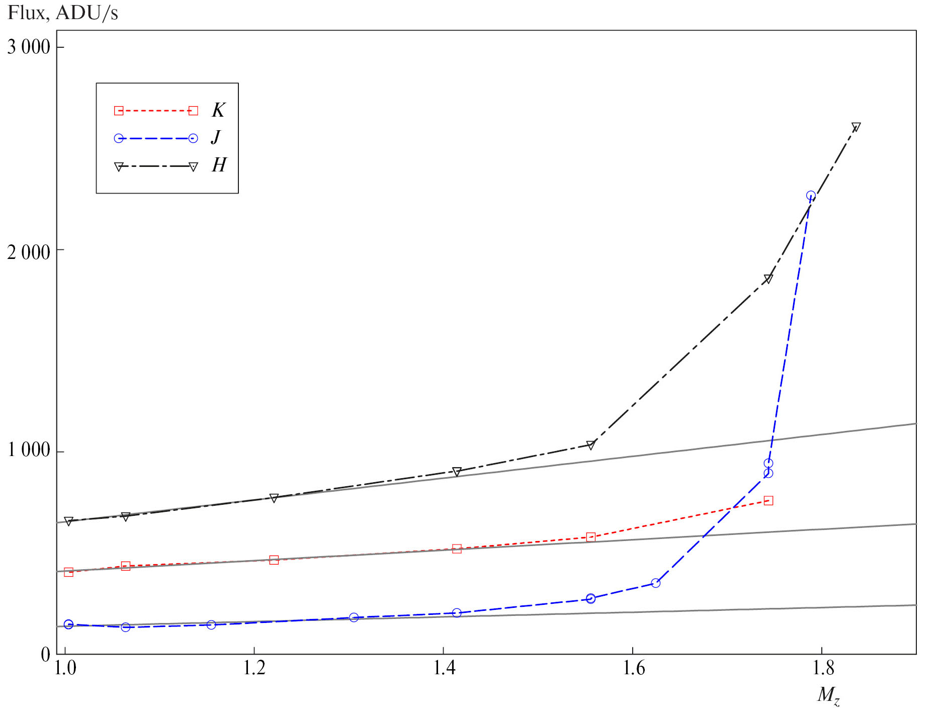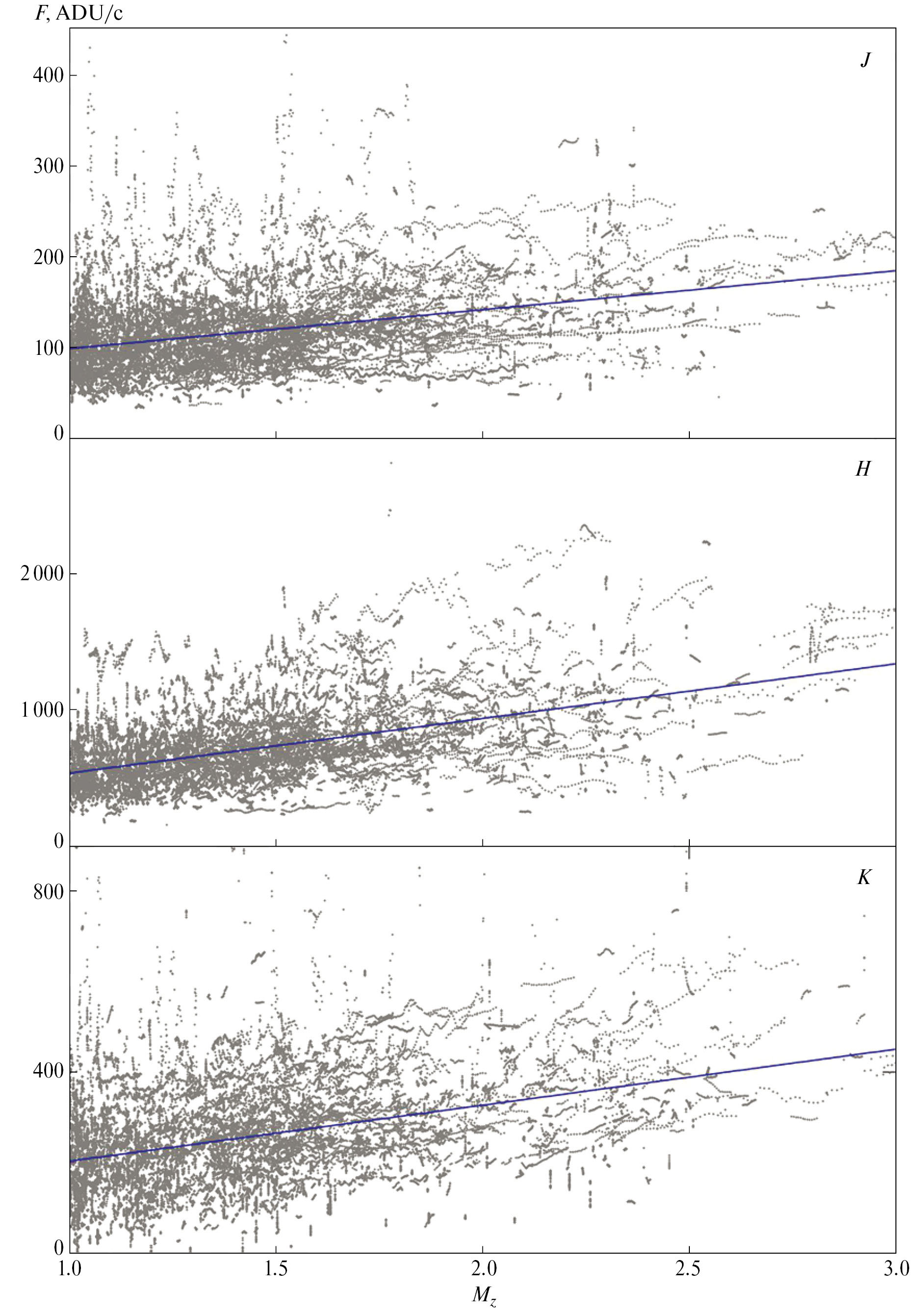 Как уже говорилось ранее, угол наклона аппроксимирующей наблюдения прямой говорит о величине вклада излучения атмосферы в общий фон в зените. Согласно данным, представленным на рис. 5, для полосы J он равен 43 ADU/c, для полосы H — 400 ADU/c, для полосы K — 130 ADU/c. Свободный член в уравнении прямой дает яркость заатмосферного фона: для J — 55 ADU/c, H — 126 ADU/c, K — 80 ADU/c, а сумма найденных величин будет полной яркостью фона неба в зените. Формальная ошибка при этом получается небольшой и не описывает полученные данные. Поэтому мы будем использовать в качестве оценки ошибки величину среднеквадратического отклонения наблюдаемых точек в диапазоне Mɀ от 1.0 до 1.1. Тогда средняя наблюдаемая яркость безлунного неба в зените в полосе J составляет 98 ± 30 ADU/c, в полосе H — 526 ± 160 ADU/c, а в полосе K — 204 ± 90 ADU/c.