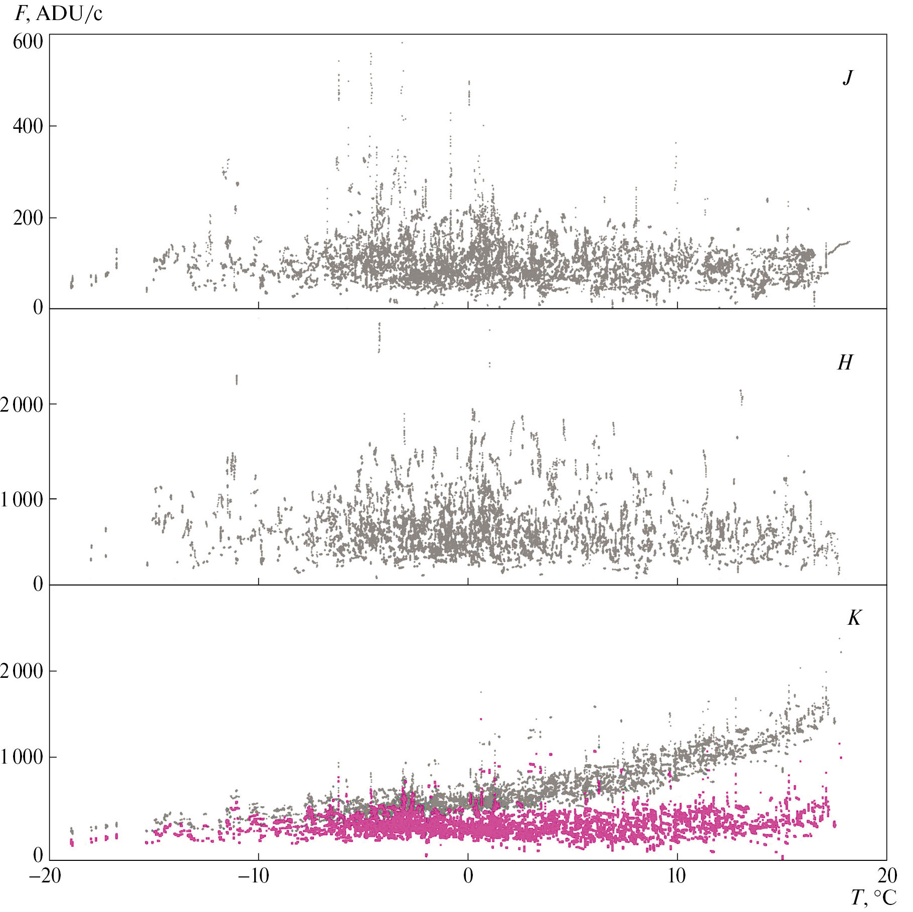Как было показано выше (рис. 1), в полосах J и H влиянием инструментального фона можно пренебречь. В полосе K его влияние велико и при любых рабочих температурах воздуха сравнимо или превышает влияние других компонентов фона. Однако на рис. 3 показано, что в полосе K можно с достаточной точностью предсказать величину инструментального фона, зная температуру окружающего воздуха. Поэтому дальше в этом разделе мы будем рассматривать измеренные потоки в полосах J и H, а в полосе K — потоки, скорректированные за вклад инструментального фона.