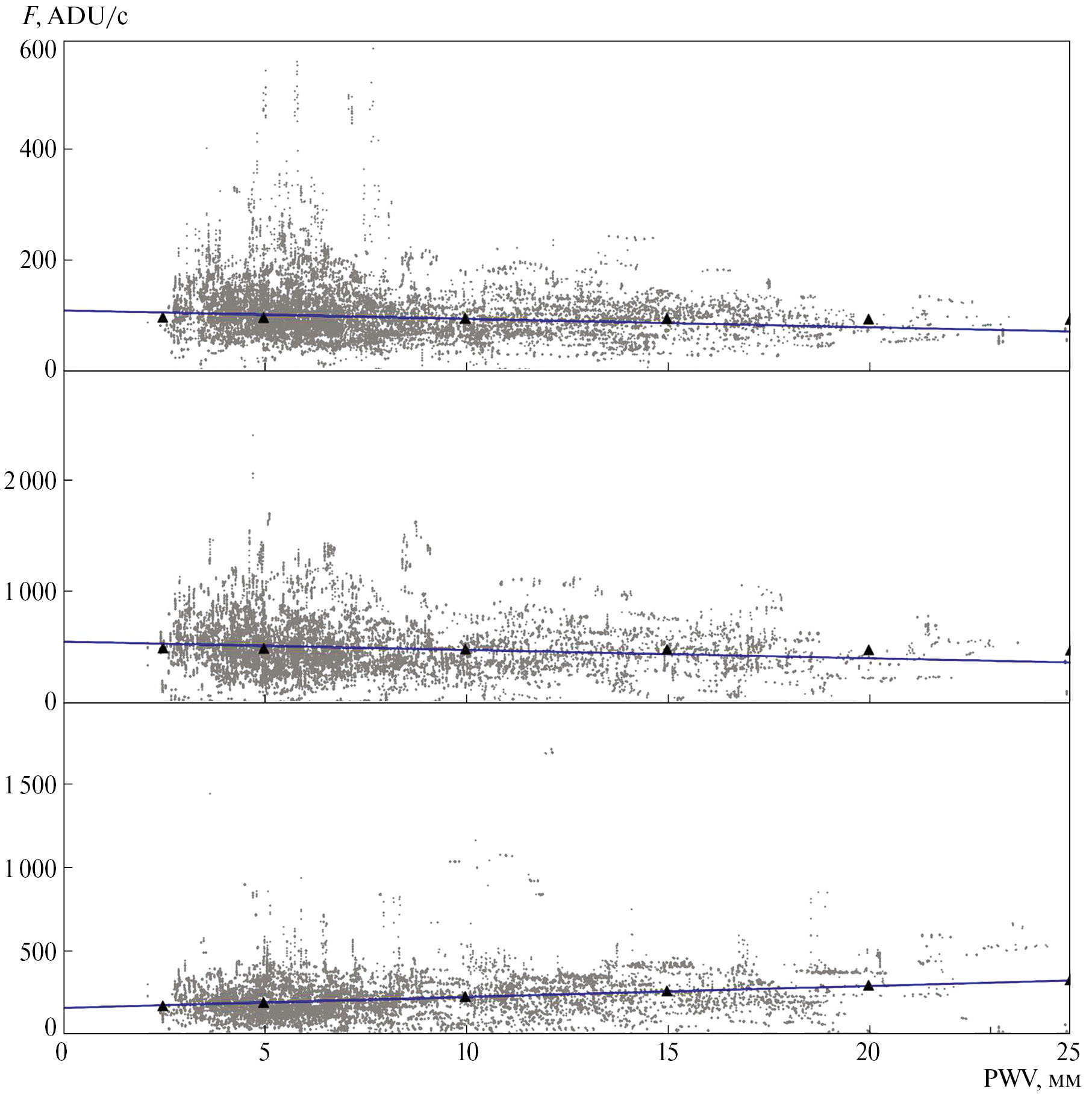 Несмотря на то, что полосы фотометрической системы MKO–NIR были задуманы [12] таким образом, чтобы уменьшить влияние переменности пропускания земной атмосферы из-за изменения PWV в условиях высокогорных обсерваторий (к которым относится и КГО), такая зависимость существует, что подтверждается модельными расчетами и данными наблюдений. На рис. 7 приведены зависимости яркости фона неба от содержания воды в полосах J, H, K. Модельные расчеты, выполненные в SKYCAL, предсказывают слабое понижение уровня фона (примерно на 5% при изменении PWV с 2.5 до 20 мм). Оно связано с ростом поглощения на краях полосы пропускания фильтров, вызывающего поглощение излучения верхних слоев атмосферы. Данные наблюдений показывают большее падение яркости фона до ~20%. В полосе K модельные расчеты хорошо совпадают с наблюдениями, показывая увеличение яркости фона неба примерно на 50%.