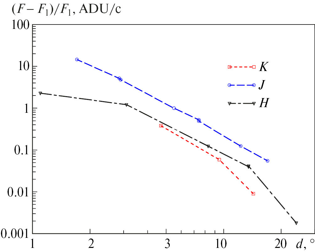 В работе сделана оценка максимального вклада рассеянного атмосферой излучения Луны. Наблюдения проводились вблизи полнолуния при небольшой высоте Луны над горизонтом. Измерения показали, что на угловом расстоянии >10° вкладом Луны в фон неба можно пренебречь даже в коротковолновой полосе J (добавка к уровню фона в зените 20%). При угловом расстоянии <5° во всех фильтрах вклад лунного излучения велик и требует учета. При расстоянии 5° величина фона неба увеличивается в 2 раза в полосе J и до 30% в полосе K (рис. 9). Полученная нами форма зависимости количества рассеянного света от углового расстояния не характерна для случая релеевского рассеяния, что говорит о значительном вкладе аэрозольного рассеяния в ночь наблюдений.