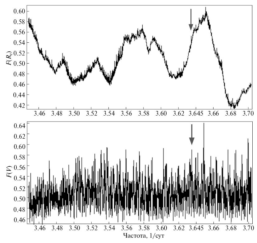 На рис. 1 приведены спектры мощности, полученные для двух массивов наблюдений, вверху — по наблюдениям в фильтре Rc, внизу — в фильтре V соответственно. Поиск орбитального периода выполнялся в диапазоне частот 3.45–4.0 сут–1, что соответствует пробным периодам 0.25–0.29d, сдвиг по фазе составил 0.0005.