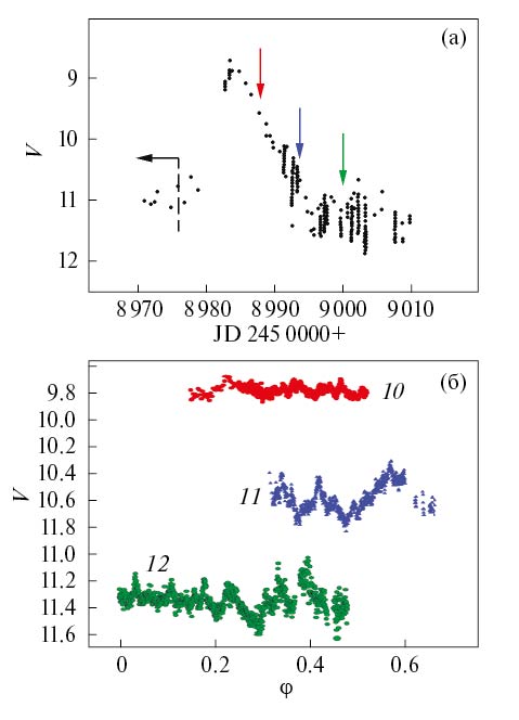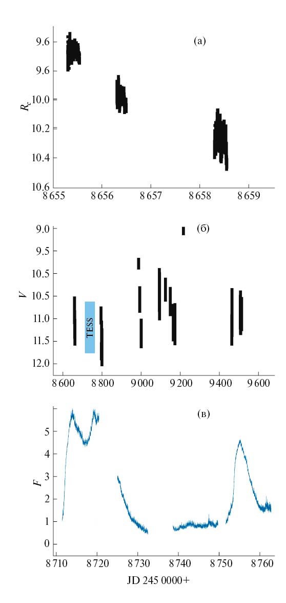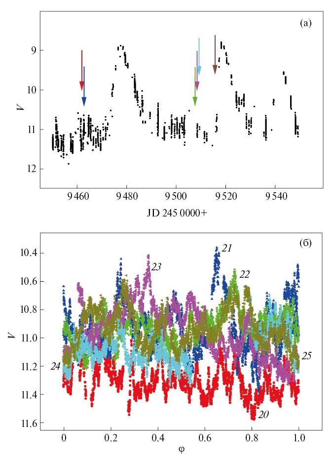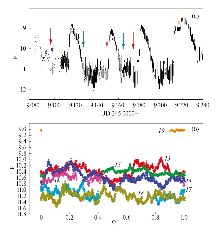 Поскольку средний уровень блеска системы меняется со временем (до 2m по нашим наблюдениям, см. табл. 2), на первом этапе для каждого из 22 сетов наблюдений в фильтре V и 3 сетов в фильтре Rc мы определили средний уровень блеска. Его значение приведено в 7-м столбце табл. 2.