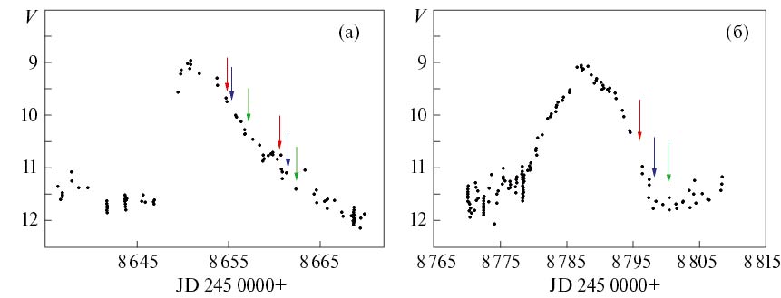 Дневник наблюдений приведен в табл. 2. Данные, полученные на телескопе АЗТ-5, в фильтре V были приведены к инструментальной системе телескопа Цейсс-2 согласно формуле, определенной нами ранее [46, 47, 48]: