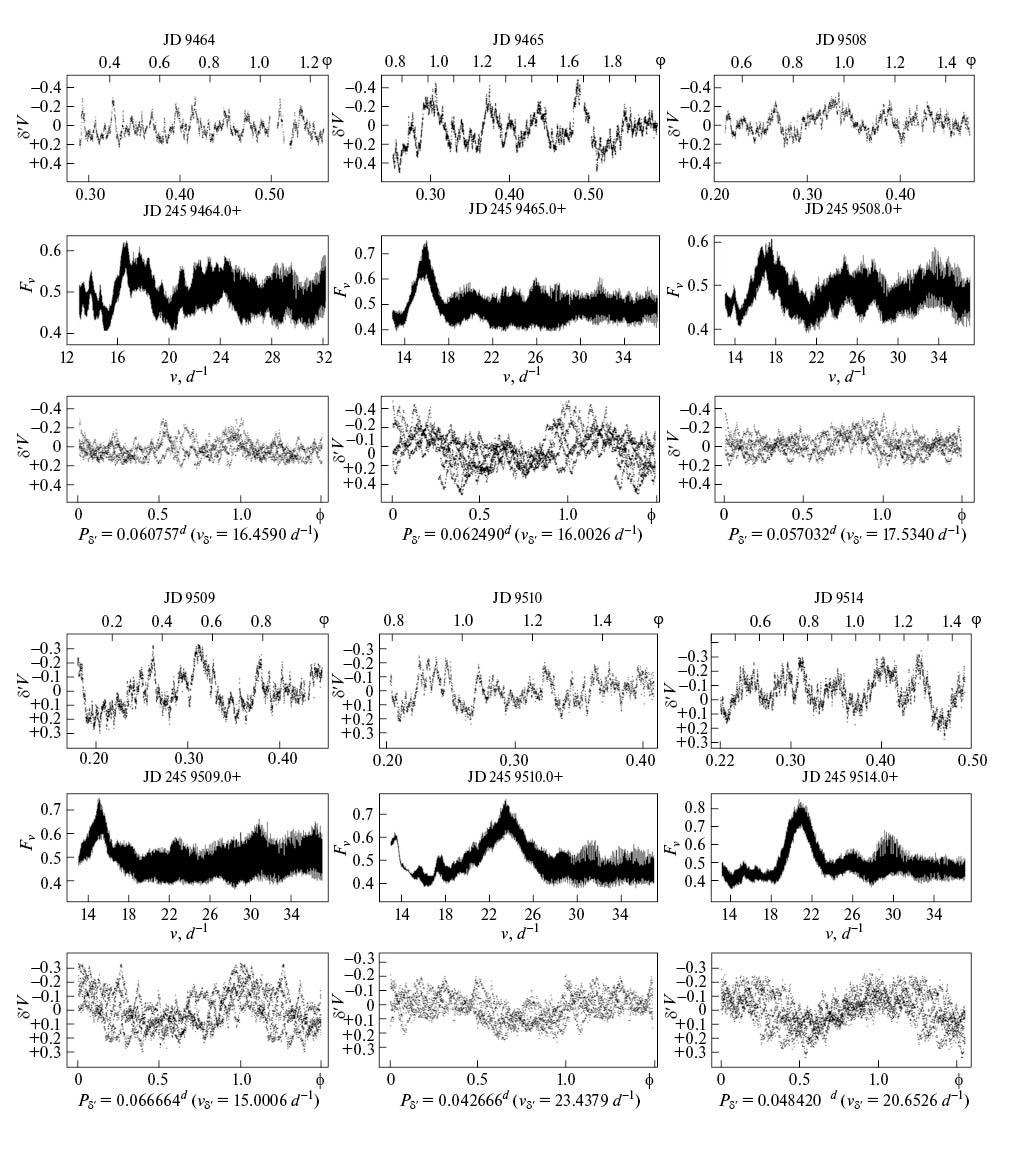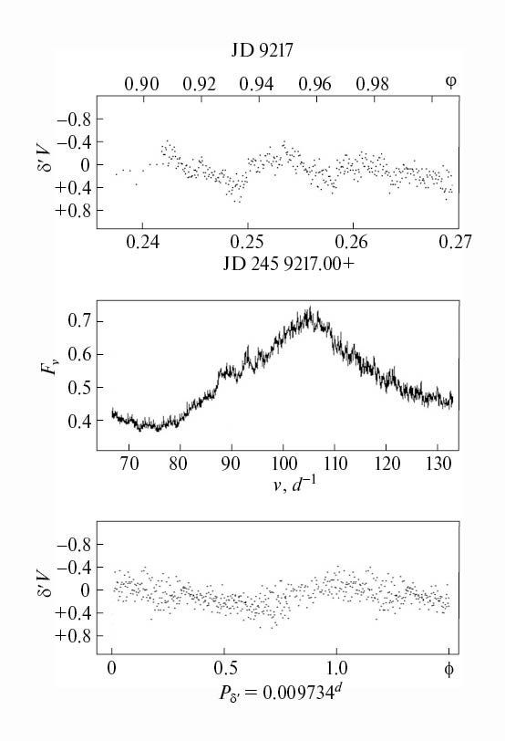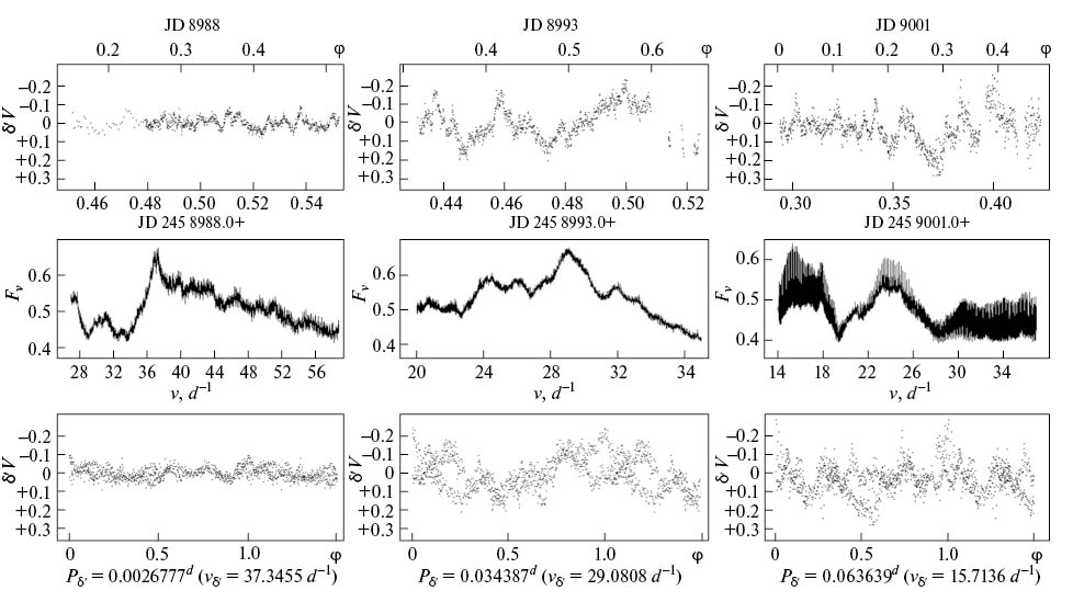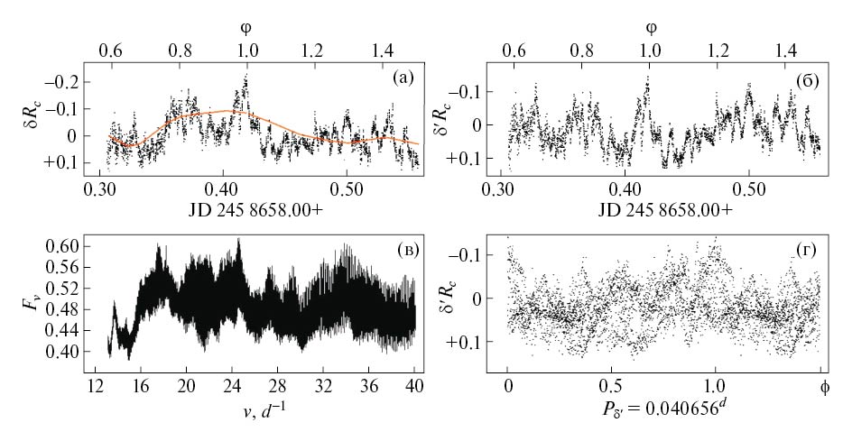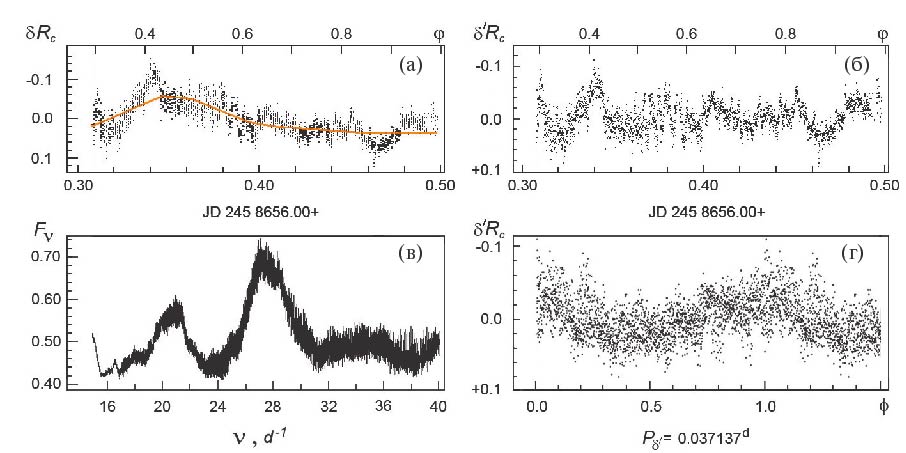 На обеих приведенных периодограммах присутствует общий пик на частотах νR = 3.6484 и νV = 3.6488 сут–1 (соответствующие значения периодов составляют PR = 0.274097d и PV = 0.274066d). Это на ~0.4% меньше значения, полученного в работе [42]. Различие в значениях периодов составляет ~0.01%, поэтому в дальнейшем для расчетов использовалось среднее значение