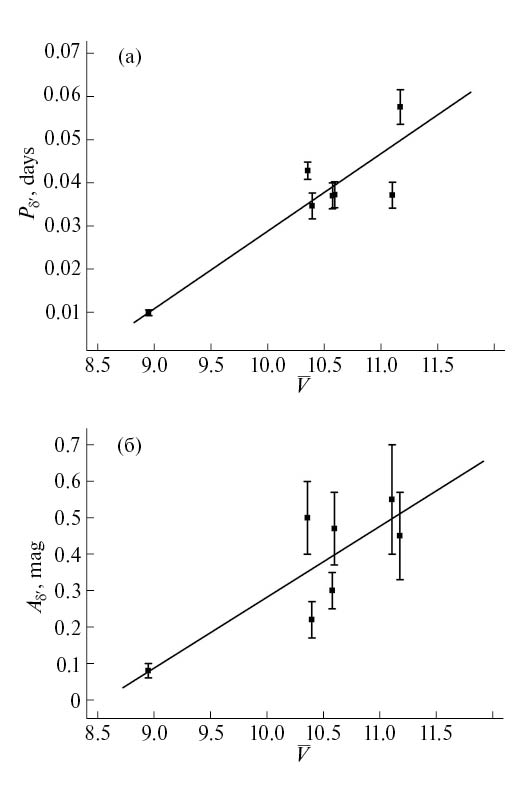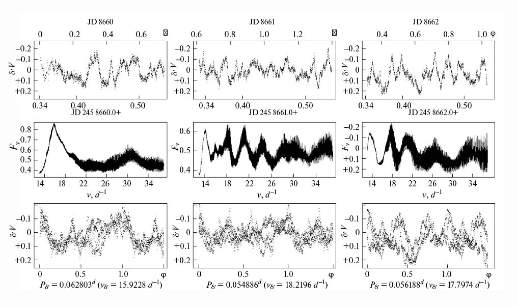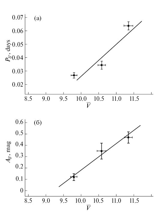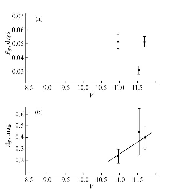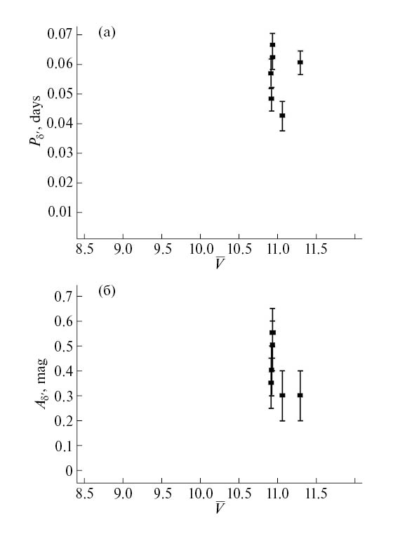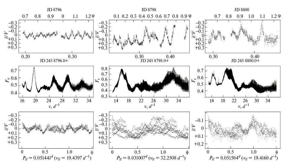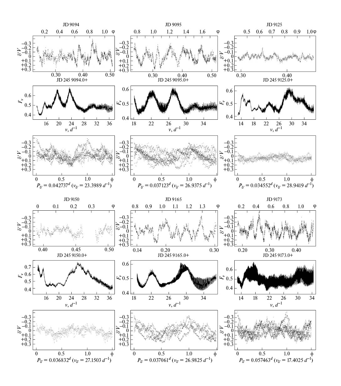На обеих приведенных периодограммах присутствует общий пик на частотах νR = 3.6484 и νV = 3.6488 сут–1 (соответствующие значения периодов составляют PR = 0.274097d и PV = 0.274066d). Это на ~0.4% меньше значения, полученного в работе [42]. Различие в значениях периодов составляет ~0.01%, поэтому в дальнейшем для расчетов использовалось среднее значение