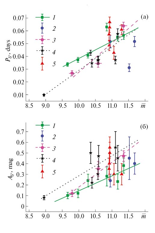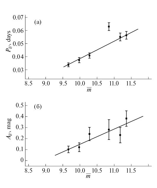 Полученные значения периодов фликкеринга и их амплитуд зависят от среднего уровня блеска системы: с ростом светимости обе эти величины линейно уменьшались: при блеске SS Cyg ~ 9 характерное время и амплитуда фликкеринга составили соответственно и ; с уменьшением блеска системы до ~ 12m они равны уже 0.06–0.07d и 0.3–0.5m. В каждой из наших групп наблюдений зависимость и индивидуальна, разброс данных с падением блеска системы усиливался.