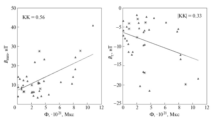 На рис. 1 приведены зависимости магнитных параметров МКВМ Bmax, Bz от магнитного потока. Наибольший коэффициент корреляции (по модулю более 0.4) наблюдается только между магнитным потоком и максимальным значением модуля магнитного поля (0.56). Скорее всего, это связано с большой долей комплексов в нашей серии событий (30 событий из 37, ≈80%).