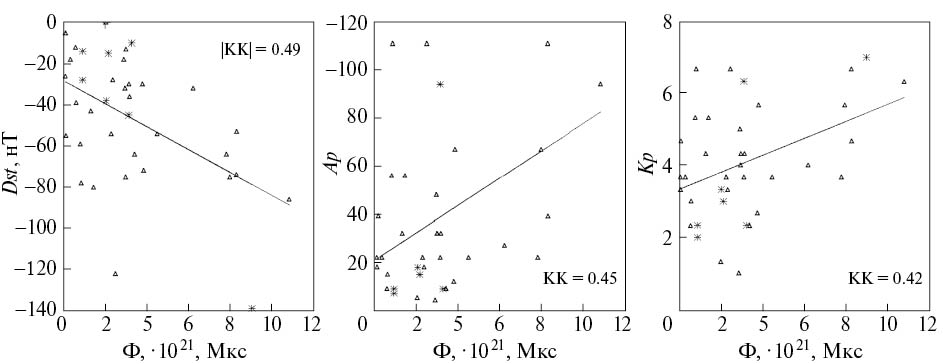 Рис. 2. Слева: график зависимости минимального значения Dst-индекса для 37 событий от полного магнитного потока из области диммингов; по центру: зависимости максимального значения Ар-индекса от полного магнитного потока из области диммингов; справа: зависимости максимального значения Кр-индекса от полного магнитного потока из области диммингов. Треугольниками выделены МКВМ, входящие в состав комплексов, звездами — одиночные события.