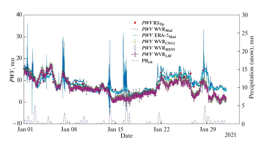 На рис. 2 приведены изменения осажденного водяного пара PWV в январе 2021 г., оцененные по данным реанализа ERA-5 для ближайшего узла сетки к Менделееву, по данным измерений ГНСС станций в Менделееве и Долгопрудном, измерений с помощью РВП в Менделееве и данным РЗ в Долгопрудном. Анализ рис. 2 показывает, что данные РВП в Менделееве содержат значительные помехи. Анализируя данные ближайшей метеостанции в Тушине, расположенной в 25 км по прямой видимости от Менделеева, можно отметить, что эти помехи могут быть связаны с осадками. В периоды осадков радиометр водяного пара существенно завышает значения осажденного водяного пара в виде резких максимумов, отличающихся на 10–20 мм относительно некоторых фоновых значений.