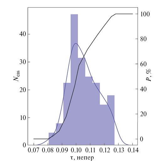 Рис. 7. Функция вероятности повторяемости значений оптической толщи для длины волны излучения 3 мм, полученная по данным радиометрических измерений, адаптированная из работы Бубнова [34], для места расположения Большого телескопа азимутального. Черная линия соответствует накопленной вероятности повторяемости, синяя линия — ядерной оценке плотности распределения.