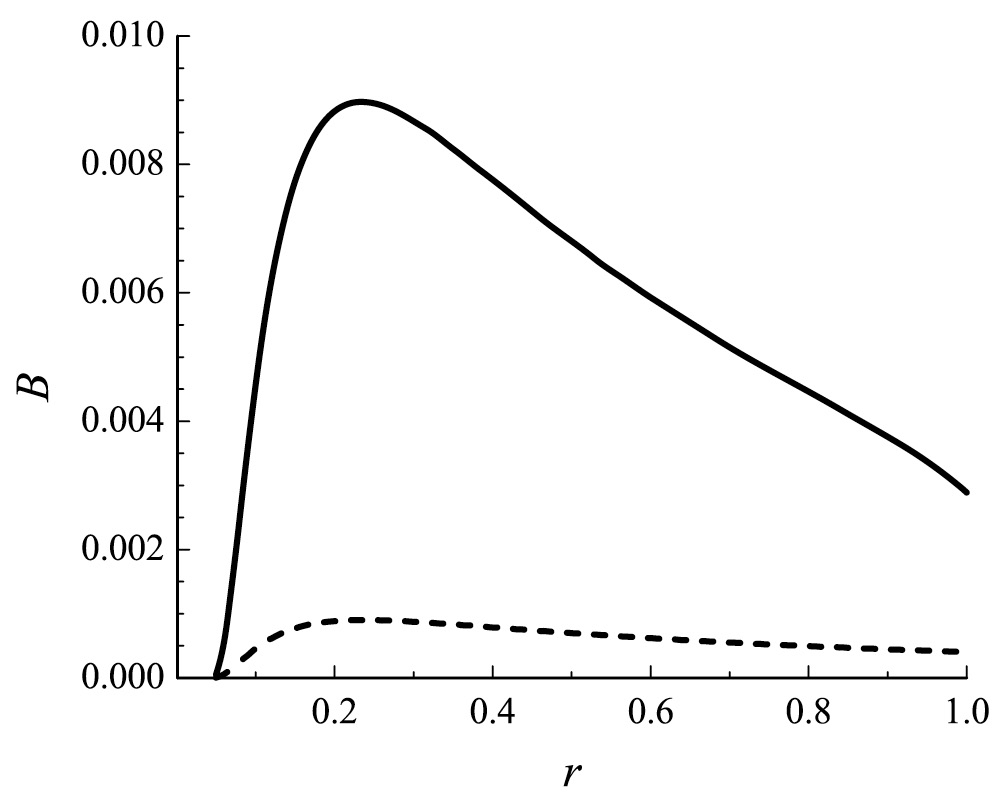Рис. 3. Магнитное поле для Rmin/Rmax = 0.02. Сплошная линия соответствует α = 102, штриховая — α = 103