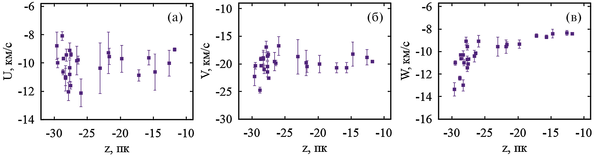 На рис. 3 даны зависимости скоростей U, V и W от координаты z для 26 звезд ассоциации ε Cha. На всех трех панелях хорошо видны два сгущения звезд, которые разделены границей z = –25 пк. Особенно отчетливо они видны на рис. 3(в).
