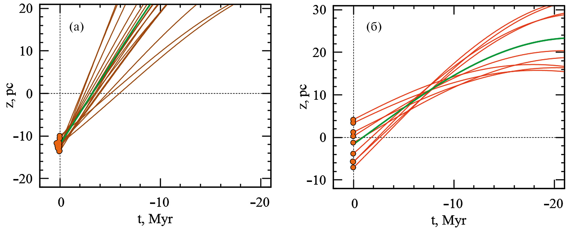 На рис. 4 дано вертикальное распределение звезд двух выборок и траектории их кинематических центров, вычисленные по звездам каждой выборки. На панели (a) хорошо видно, что звезды совсем недавно (~1 млн лет назад) сошлись вместе, а вот звезды на панели (б) занимали минимальный размер, по крайней мере, вдоль оси z около 8 млн лет назад, и демонстрируют в настоящий момент расширение.