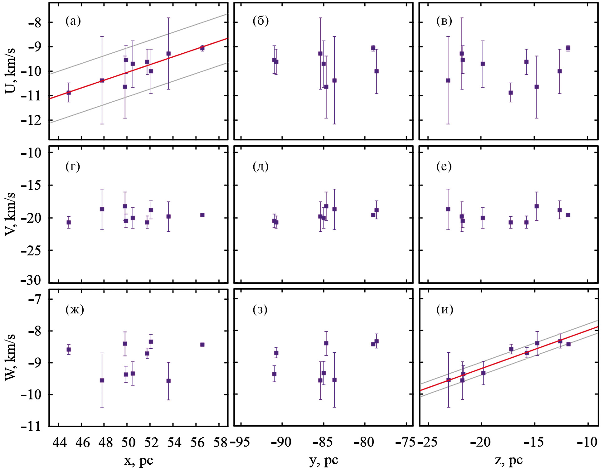 На рис. 5 даны зависимости скоростей U, V, W от координат x, y, z для выборки из 9 звезд, отобранных при условии z > -25 пк. На панелях (a) и (i) красными линиями показаны найденные по этим данным методом наименьших квадратов зависимости, соответствующие градиентам ∂U/∂x = 159±36 км/с/кпк и ∂W/∂z = 120 ± 14 км/с/кпк. Указаны границы доверительных областей, соответствующих уровню 1s. Других значимо отличающихся от нуля градиентов по этим звездам не обнаружено. На основе соотношения (4) с использованием двух найденных градиентов можем оценить коэффициент угловой скорости расширения этой звездной группировки в плоскости xz: