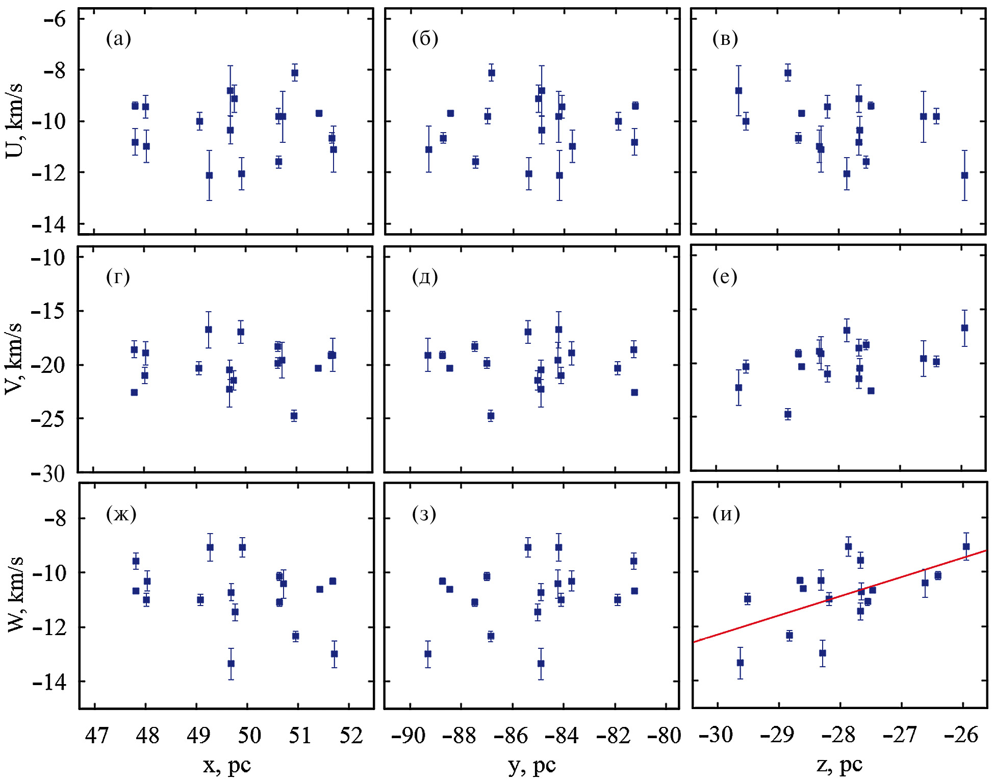 На рис. 6 даны зависимости скоростей U, V, W от координат x, y, z для выборки из 17 звезд, отобранных при условии z < -25 пк. По звездам этой выборки методом наименьших квадратов был найден только один значимо отличающийся от нуля градиент, ∂W/∂z = 707 ± 248 км/с/кпк. Соответствующая зависимость дана красной линией на рис. 6(и), где доверительная область не показана, так как она слишком широка. Соответствующее значению этого градиента время, прошедшее от начала расширения вдоль оси z звездной системы до настоящего момента, составляет: