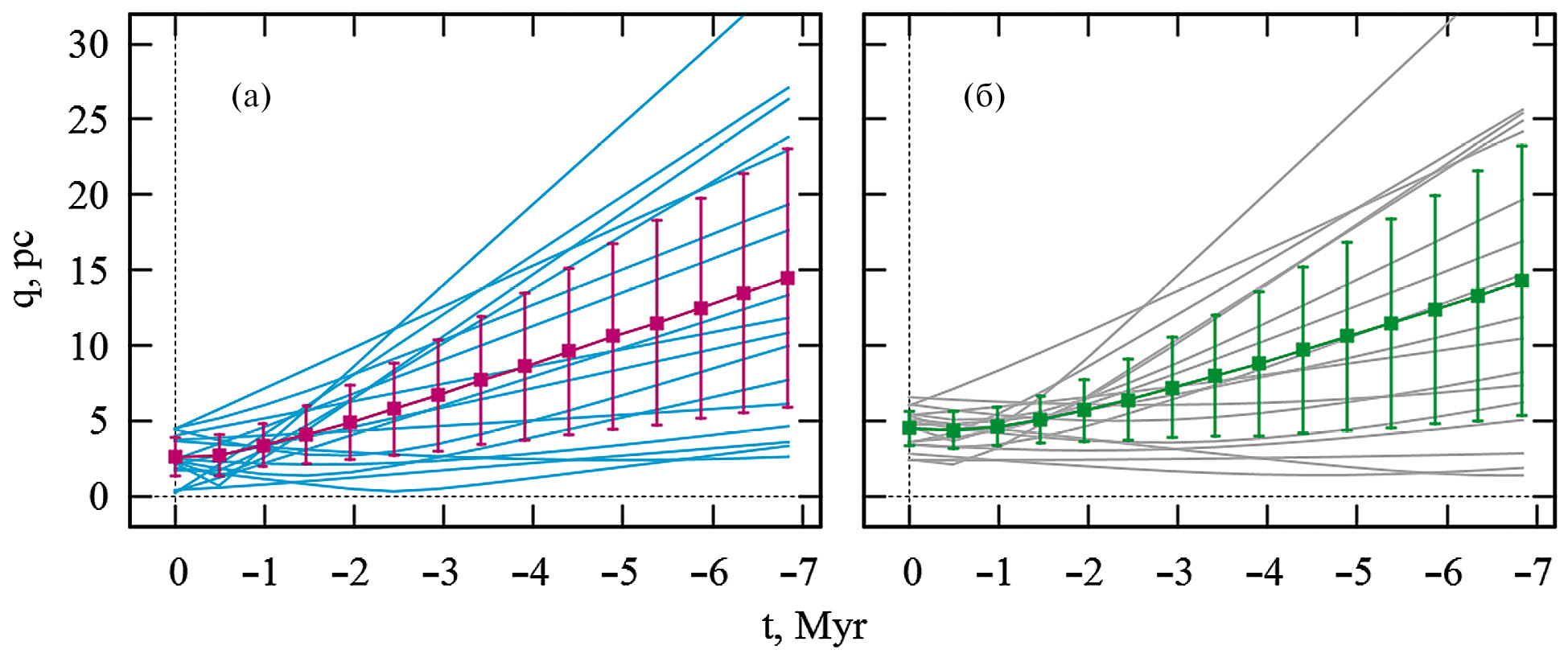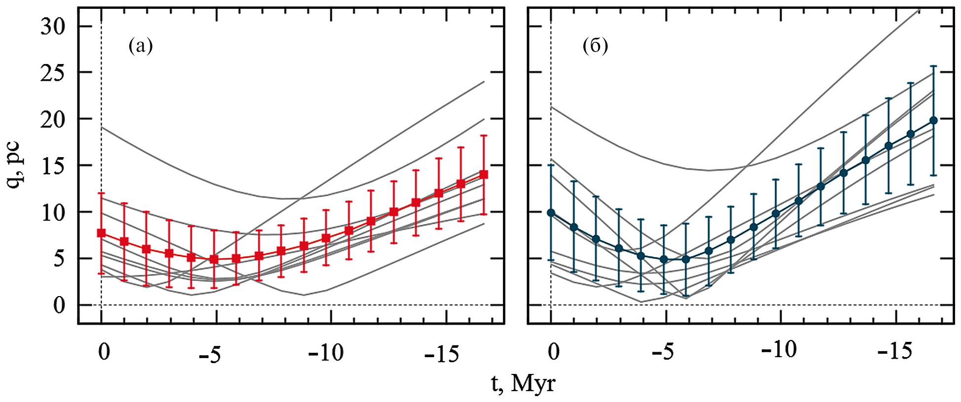 На рис. 7 даны орбиты выборки из 9 звезд с z > -25 пк, построенные для двух вариантов кинематического центра. На рис. 7(a) использованы параметры кинематического центра, вычисленные по 9 звездам выборки. На рис. 7(б) были использованы параметры кинематического центра, вычисленные по всем 26 звездам ассоциации. В обоих случаях хорошо виден прогиб линии средних значений в районе 5 млн лет, а в случае рис. 7(б) прогиб более отчетливый. Однако на панели (a) меньшие значения дисперсий в каждом интервале. Анализ показанных на рисунке средних значений и их дисперсий дает возможность оценить момент времени, при котором размер звездной системы в прошлом был минимальным. В итоге было найдено значение