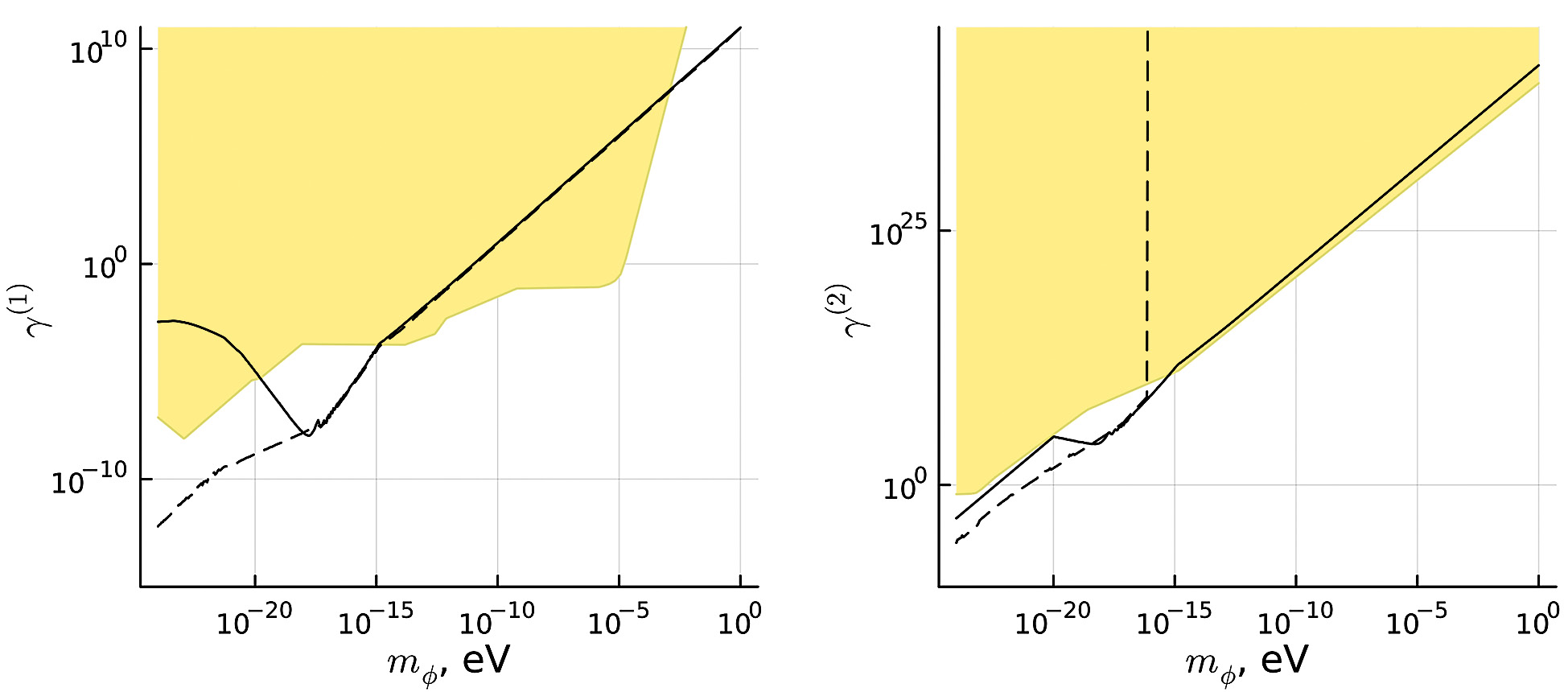 Одним из перспективных кандидатов на роль темной материи (ТМ) являются легкие скалярные частицы, описываемые действительным скалярным полем φ и обладающие длинами волн де Бройля, намного превышающими расстояние между частицами. Из-за очень больших чисел заполнения этот вид ТМ может быть описан с помощью волн классического поля φ, в силу чего такую ТМ часто называют волновой. Массы частиц для этого типа ТМ лежат в диапазоне от 10–24 эВ до 1 эВ. Волновая ТМ приводит к ряду интересных явлений, таких как бозонные звезды, колебания плотности и вихри ТМ (см., напр., обзор [1]). Поле φ может взаимодействовать с другими полями материи и колеблется с комптоновской частотой в диапазоне от 10–10 до 1014 Гц, что стимулирует проведение экспериментов по прямому детектированию этих колебаний. На константы связи был наложен ряд ограничений с помощью экспериментов с атомными часами на основании данных гравитационно–волновых детекторов, пульсарного тайминга, планетных эфемерид, тестов эйнштейновского принципа эквивалентности (ЭПЭ), экспериментов типа Этвеша и др. [2–11].
